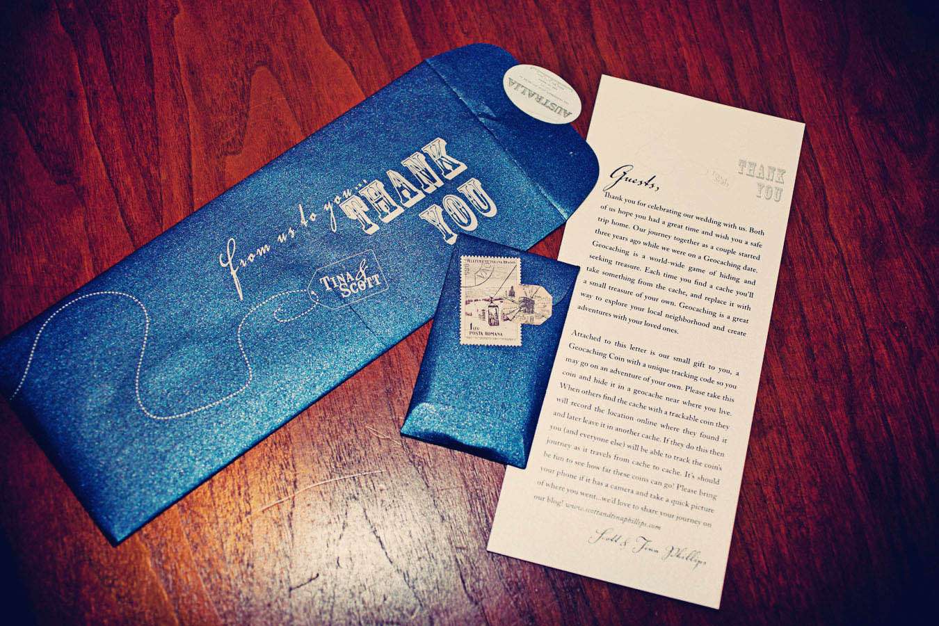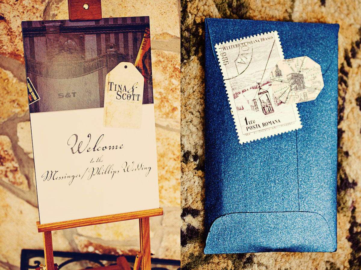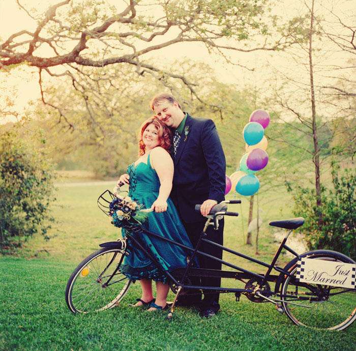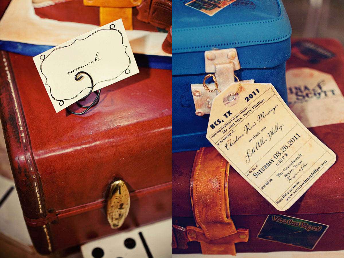 Tina & Scott’s travel and craft themed wedding took place at The Greenbranch, Texas. It was predominately a DIY wedding influenced by the couple’s travels. “It was mostly a do-it-your self peacock inspired wedding with a splash of anything vintage was a blast,” the couple told me. “Our invitations were an image of a vintage suitcase with travel stickers of places we have visited. This connected with our first date; a “geocaching date”. We not only wanted to share our journey as a couple with our guests but also encourage them to have an adventure of their own. The wedding favors for the evening were uniquely trackable geocaching coins designed by us.”