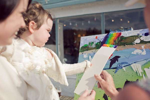 The entertainment the couple laid on was also quite unique. Firstly they had a friend who plays the guitar serenading their guests outside, and secondly (and again, channelling Claire’s inner art teacher) they asked their guests to contribute to a painting for the couple to then take home. “While photos were happening was a couple of local artists from Fyne Studios where there and our guests were invited to add to a painting of our day that we could take home and have forever. It was perfect. Our friends and family painted Inver Cottage, the ruins of the castle, and what was happening on the top, and underneath the water, continuing fish theme. Maggie added the rainbow. We finished off the painting by adding two hearts over Inver Cottage.”