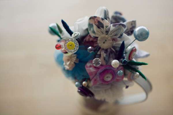 The ‘flowers’ were hand crafted by the bride, her Mum and some of the bride’s willing students (Claire is an art teacher.) “The pupils were especially good at the button flowers,” she explained. “They made my daughter Maggie’s bouquet for me and I love it. All the fabric was vintage scraps I have collected. The buttons, beads and pearls came from my Gran’s collection and a couple of friends Mums.”