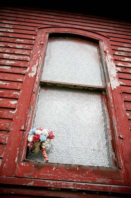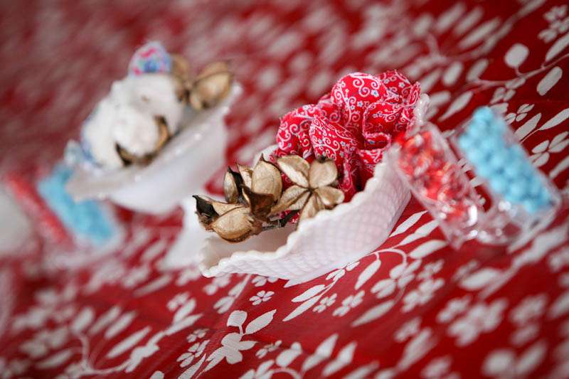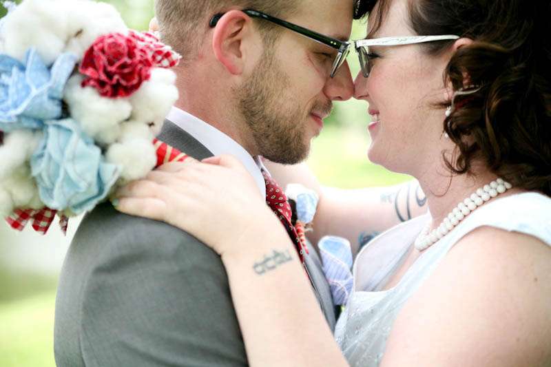 Heather also crafted her own fabric flower bouquet and you can see the fabulous tutorial that you used here. The centrepieces were created by J Morse Designs. “She used a combination of dried cotton balls and fabric flowers made by my friends and I,” Heather explained. “The cotton used in my bouquet was cotton that we got from a field in Arizona but most of it be bought from cottonman.com. We added in a few other elements, put everything in my extensive collection of milk glass and it all came together perfectly!”