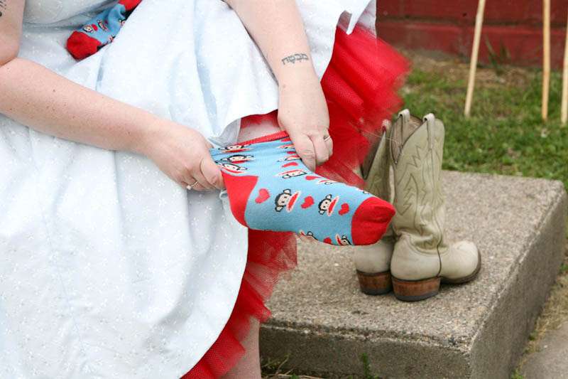 Heather’s Mother made her dress based on an 1957 pattern, “Since my Mom lives in Idaho and I live in Indiana there was a lot of mailing back and forth and some final touches that waited till we were all in the same state,” Heather continued. “The underskirt with the bit of red peeking out was an altered thrift store find. I was tempted to use a Square Dance skirt but they were too short so I cut the bottom tier off a full length skirt and added the red. I think I would have been lost without it and it totally made my dress!” With her dress Heather wore vintage cowboy boots and vintage jewellery.