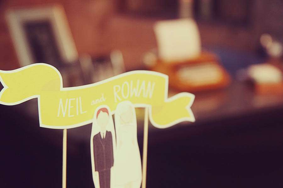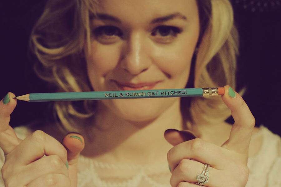 To keep things personal, the couple wanted to DIY as much of their wedding (with help from their friends & families) as they could. “I jazzed up my shoes with a pair of DIY shoe clips. I made a bow with some ribbon, used a pair of earrings on the front of the bows and sewed them on to shoe clips bought from eBay. My mum even used her sewing machine to bind the order of services together. I stole the Mad-Lib idea from another blog and got pencils made with the words ‘Neil and Rowan get hitched’ on them.”