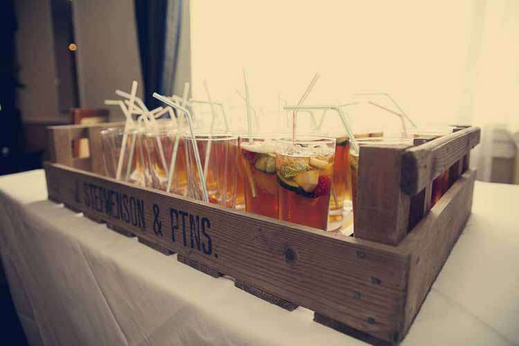 Graham and I were driven back to the hotel, and the guests walked back along the seafront. As we walked through the rotating doors of the hotel we were met by the staff greeting us as ‘Mr and Mrs Clark’ and with two flutes full of champagne. Lovely! Our guests started filtering in then, so we directed them to the 8th floor, where our reception was being held. We commissioned Lucy Ledger to design an A2 poster board that we displayed on a giant easel to pop by the entrance to the Chartwell Room, to point guests in the right direction. Although I don’t see how they could have missed the entrance, and there was a vintage apple crate full of glasses of Pimms right by it!