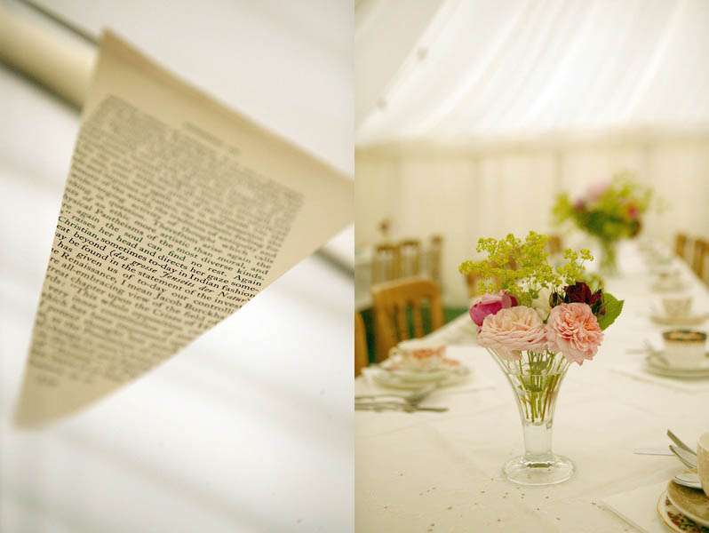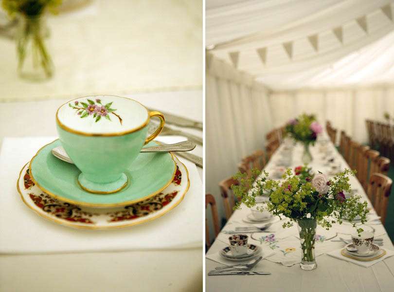 The ceremony took place at St Mary’s Dudleston, Shropshire. The bride’s Mother is a retired vicar so she performed the ceremony, making it extra special. After the touching service, the couple and their guests headed to Plas Warren, a B&B in Dudleston, Shropshire. “We had afternoon tea using vintage china and vases collected from charity shops,” continued the bride. “Dan made a load of cake stands using old plates and bits off eBay. We covered the tables with vintage tablecloths that had belonged to my Grandmother.”