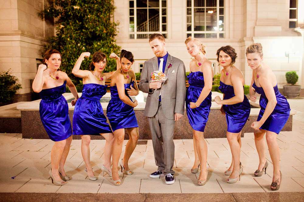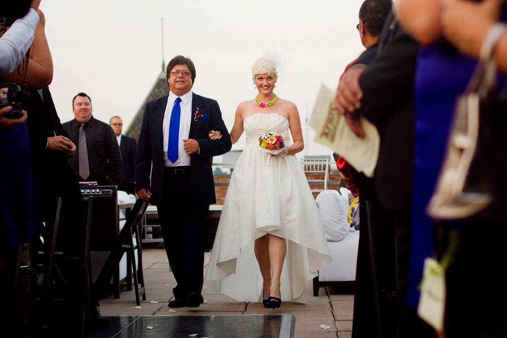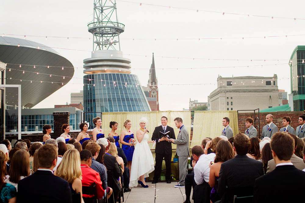 April & Christian’s rooftop wedding was held at Aerial in Nashville and from the sounds of things it was a fun-packed wedding from start to finish. “The ceremony was on the rooftop in downtown Nashville right beside all the honkey tonks,” photographer Alex Bee told me. “The bridal party DANCED down the aisle to live music played by the bride & groom’s brothers. They really got into it! The bride’s entrance had the most tension/energy/anticipation that I have ever experienced at a wedding. The bride entered the ceremony to rising beginning guitar solo of “She’s the One” by Bruce Springsteen. Did I mention that they passed out tambourines & eggshakers & encouraged the guests to play along? It was really amazing! The reception was an epic rooftop dance party + karaoke.”