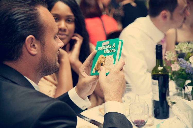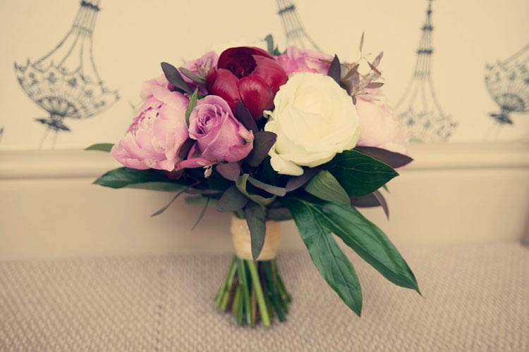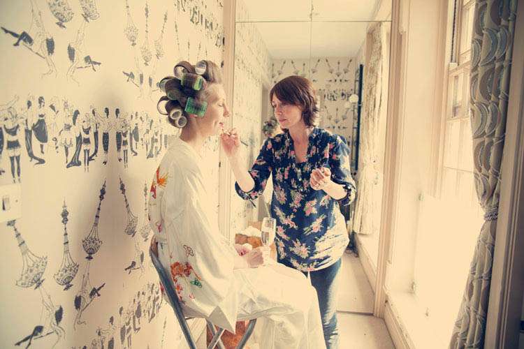 “We tried to use local suppliers. Chris designed our invites and we used a local printer. The florist was also just down the road from our flat. We also had the idea of using old books as place settings as they’d double as favours and give people something to talk about at the meal. I had a romantic notion about DIY-ing and envisaged myself wafting around serenely, creating all these wonderful little bits. It was actually bloody hard work and I spent many weekends hunched over my sewing machine making metres of bunting and matching cushions. Thankfully, my sister helped out with sewing but I had to buy some extra in – the Mr and Mrs Smith bunting and the outdoor stuff was all bought in a panic the week before the wedding, as well as some extra cushions from Primark.”