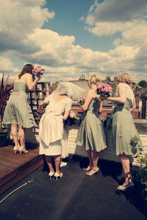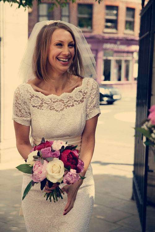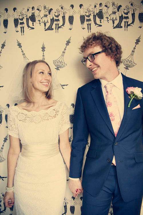 Lou went to my favourite dress shop for her vintage wedding dress, Fur Coat No Knickers in London. She explained, “When it came to my outfit, I always knew that I didn’t want a long dress. When I walked into FCNK, I completely fell in love – both with the dresses and with Laura and Emma, who run the shop. They are both so talented. At first, I’d thought that I’d go with a prom style dress but then I tried on a long fifties number and they showed me how they could transform it into a wiggle dress complete with a sash and funky ‘Priscilla Presley- style short veil. At every fitting I felt so comfortable in it and, on the wedding day, I even felt confident enough to make a speech.” Lou teamed her dress with shoes from Rachel Simpson and jewellery which was a gift from her Gran.