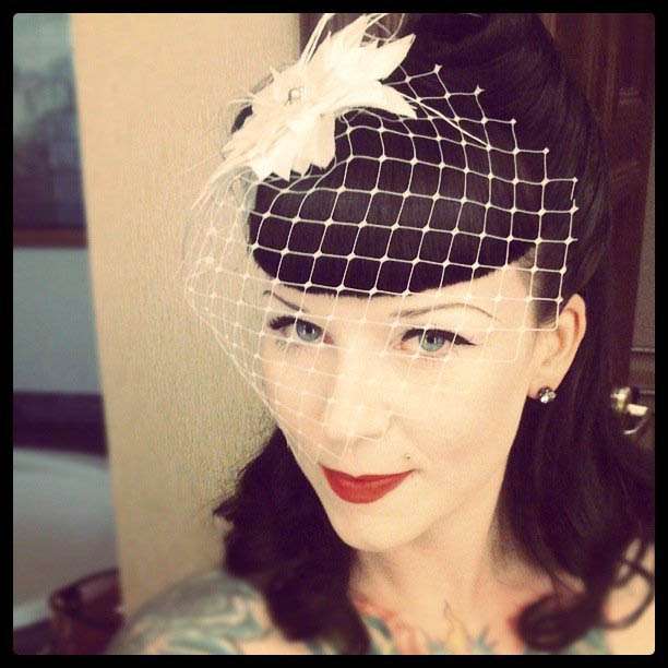 “Even though I always dreamt of a Rock n Roll Elvis wedding, I still wanted some of the traditional aspects in there. The people closest to me joke with me a lot about how I’m a tattooed rockin’ roll girl, but the truth is, I’m really an old fashioned June Cleaver wannabe! I guess the same thing kinda happened with my dress. I originally purchased a gorgeous 1950’s red dress and I was all ready to wear it, when I saw ivory, tea length dress among all the long white gowns at Wedding Wonderland…and OMG, it was GORGEOUS! It looked like a vintage dress to me, but it wasn’t! So, I tried it on ‘for fun’, because I also certainly could NOT afford the dress! I couldn’t believe it..I really kinda almost cried I loved it so much and I never thought I’d even want a ‘real’ wedding dress!”