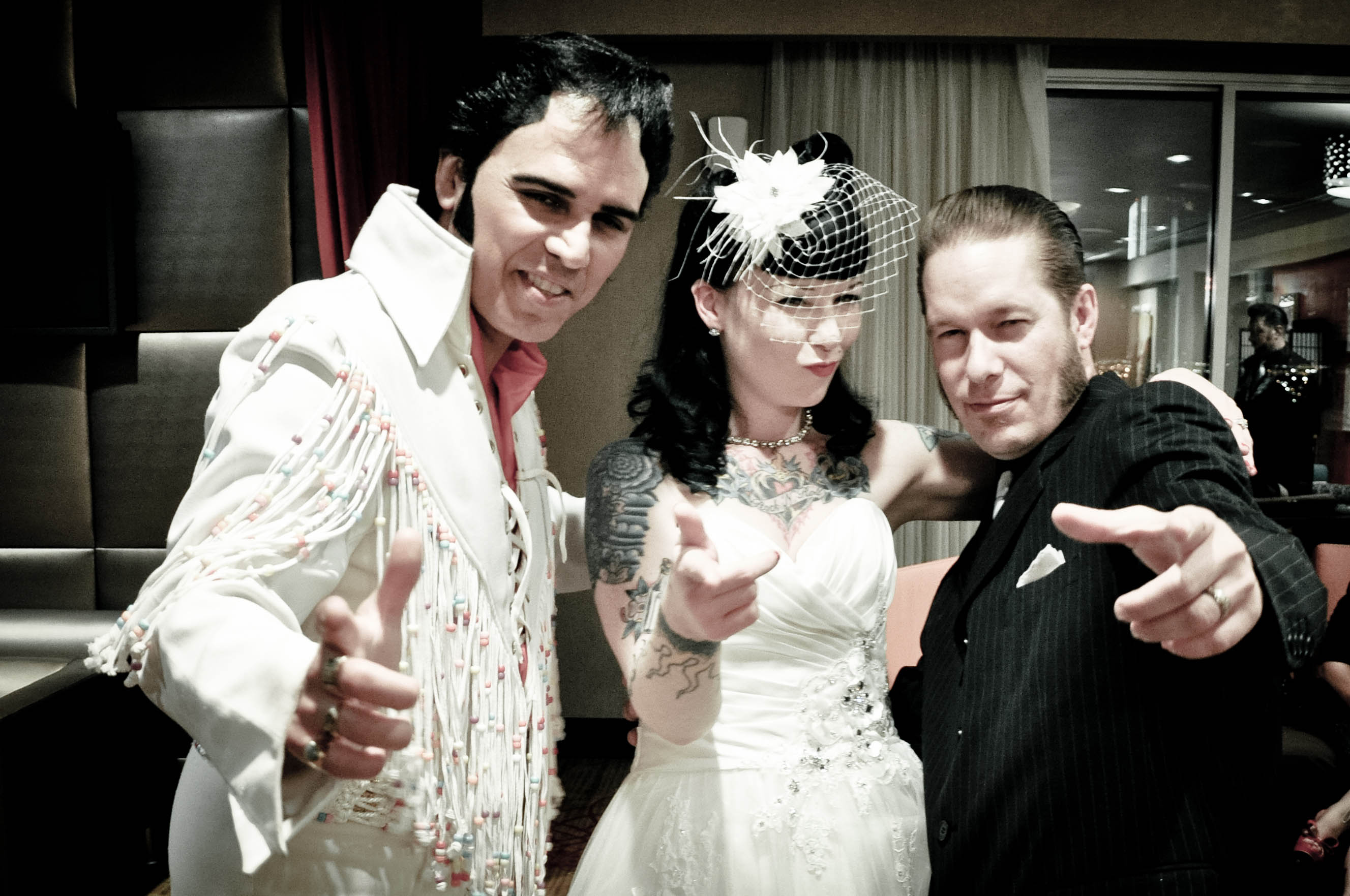 “The wedding was amazing,” Michelle wrote. “We had about 50+ friends and family that flew in from all over the country to be there for it. We decided that instead of going to an Elvis wedding chapel, that we would rent the 2,500 sq foot party suite “The Stardust Suite” in the Orleans Hotel & Casino. People usually rent it for parties & wedding receptions but we figured we would just order Elvis to come there and do the ceremony. I looked into the chapels & it seemed like most of them would only let you have a certain number of guests & the weddings sure don’t last very long. Doing it the way we did, we got the room (which was big & very nice with an amazing view of Vegas) for 6 hours.”