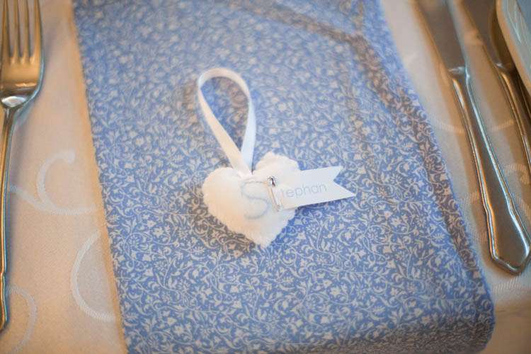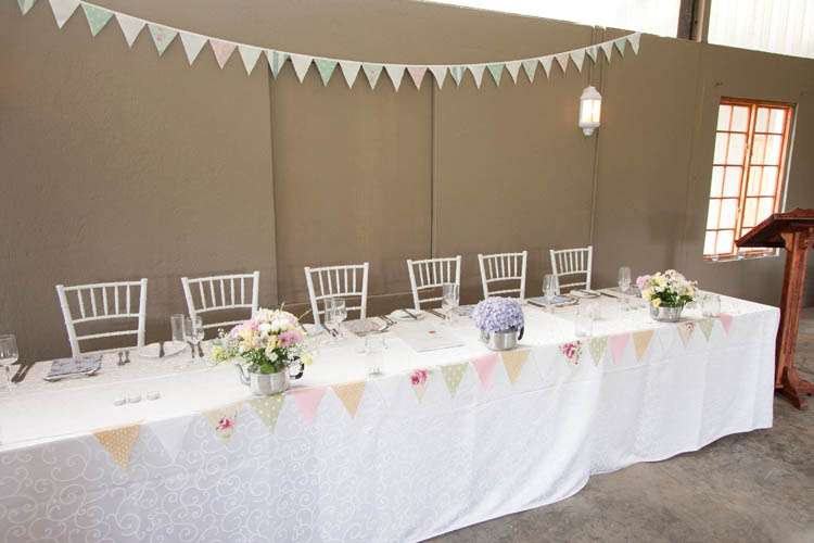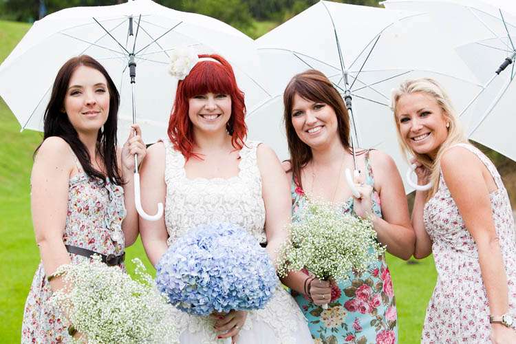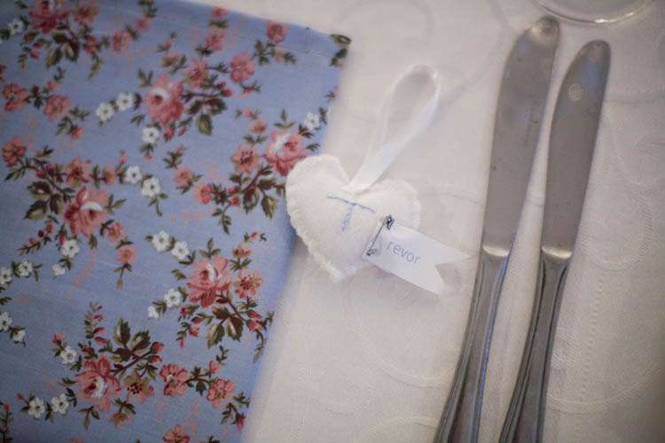 “Our guests sat on hay bales for the ceremony, we didn’t have hymns (each of our sisters read a blessing instead) and we had a handfasting ceremony within our Christian ceremony. Our men and maids didn’t matchy matchy. We had a fingerprint tree instead of a guestbook, our table flowers were arranged in giant teapots, we both made speeches (he read an excerpt from The Velveteen Rabbit about being made real and made me cry), our friends collected baby food jars for us to put candles in everywhere and the bunting made everything more fun!”