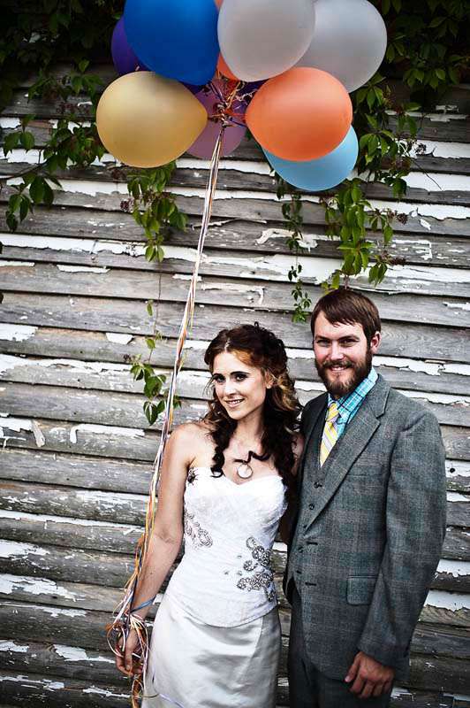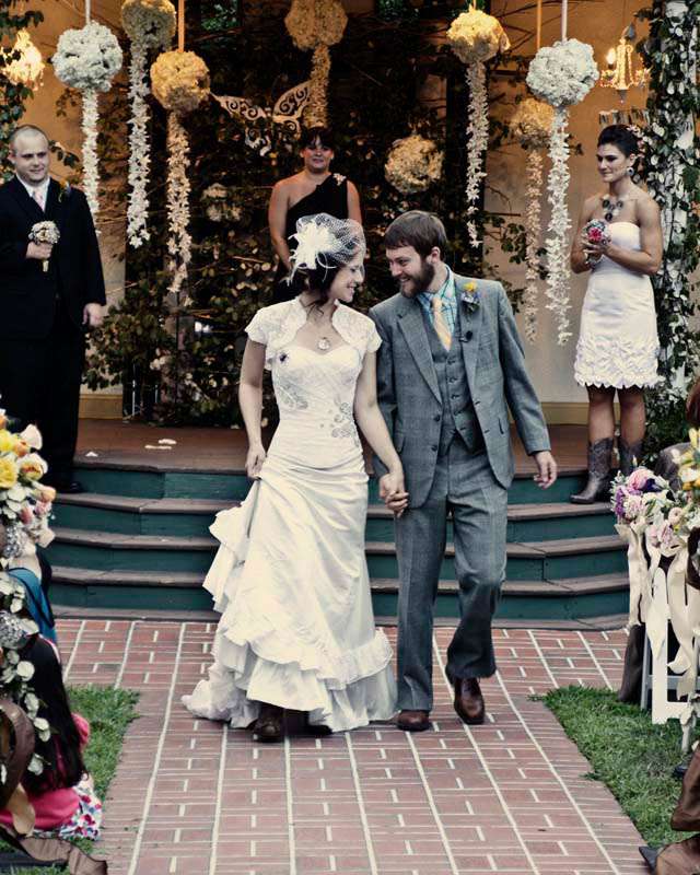 “If I had to pick a theme for our wedding it would have been “Structured Chaos”. Haphazard with a purpose,” Joie laughed. “All of our programs were tied with twine and each had a different charm on it. Each table had a centrepiece that was completely unique from any other table. Along with our wedding cake we got about 10 dozen cupcakes and each dozen had a different look. We spent a year and a half collecting 300 different china plates. If it were up to us we would have done the same to chairs and tablecloths and well…anything you can think of! But we also wanted to get married before we turned 50! Our vows were taken from ‘Between the Buried and Me’ and Butch Walker songs.”