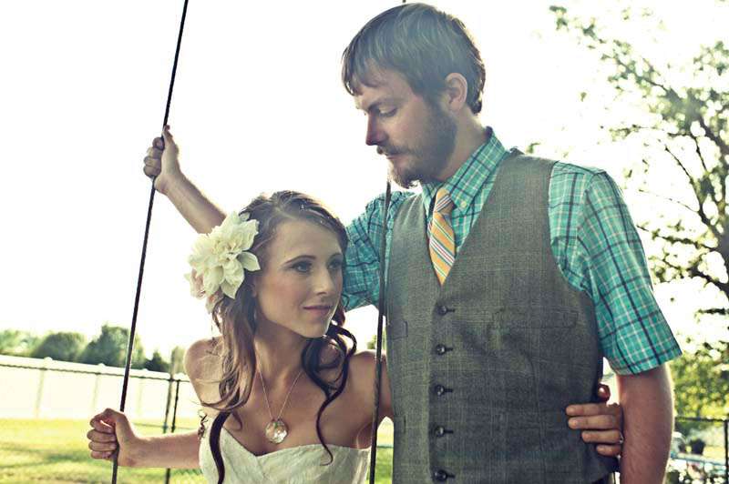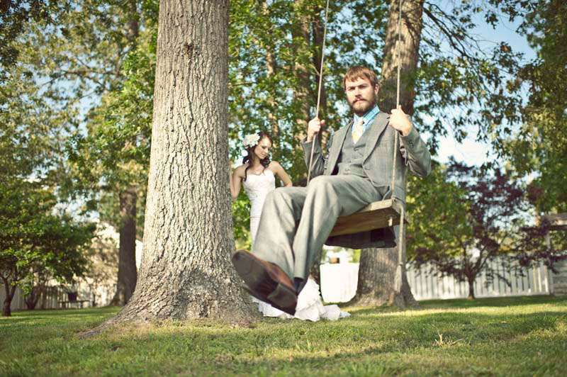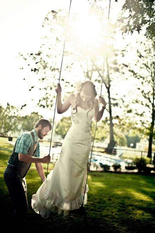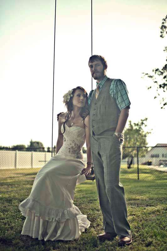 When the recently married Joie emailed me to share her awesome first dance video, I knew instantly I wanted to share it! Anyone that dances to Weezer is bad ass in my book! I was surprised though that Joie didn’t send me her full wedding as she said wasn’t sure that it wasn’t ‘Rock n Roll’ enough for the blog. Erm…no way lady! As soon as I saw the beautiful Meschantes Couture corset dress and the portraits on the swing I was smitten!