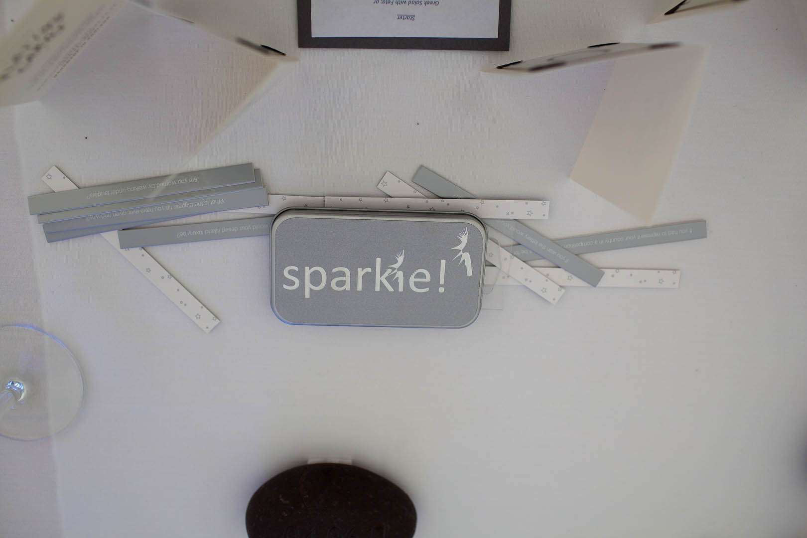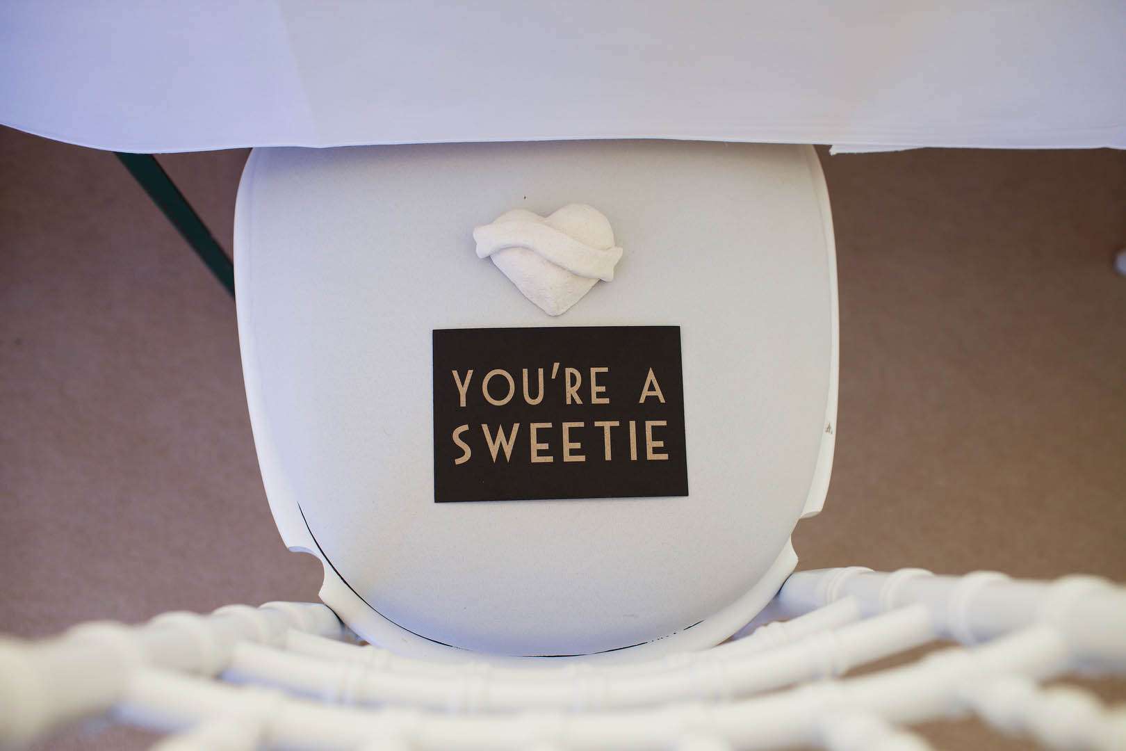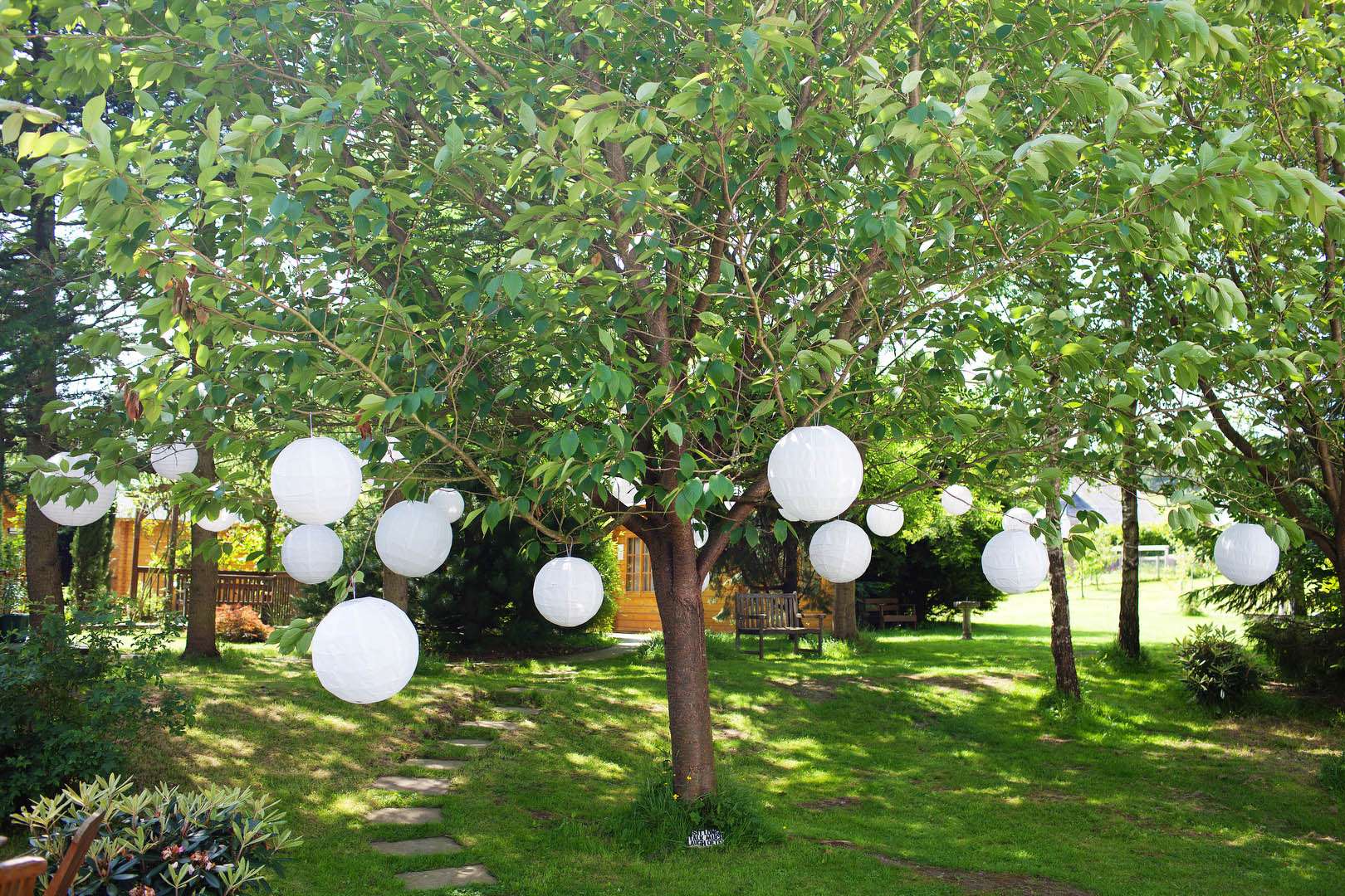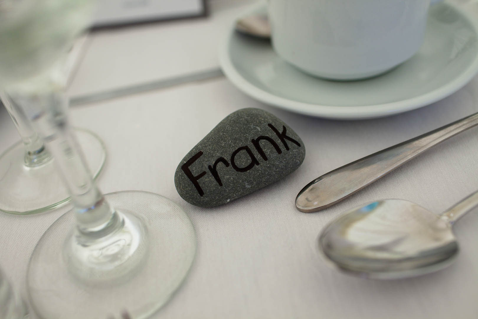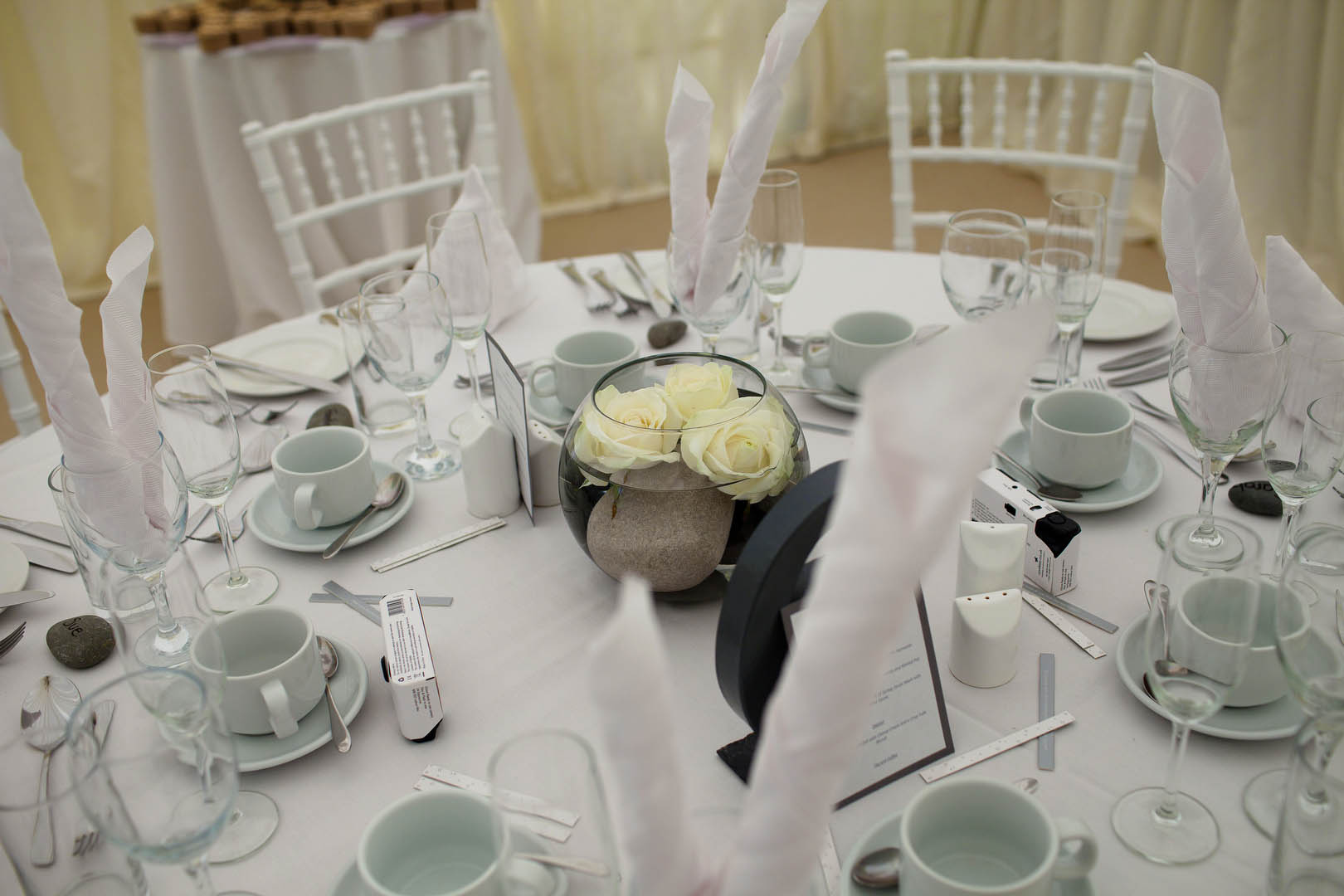 “I collected pebbles from the local beach and used these for the centrepieces and the name places. My dad also used grey slate to make the stands for the tables numbers which were bought from an online hobbycraft website really cheaply and spray painted by my dad. I also used the dress as inspiration and tried to reflect the poofyness of the dress in the choice of round chinese lanterns in the gardens, 3ft round balloons in the gardens, my round bouquet and the round “afro” like vases of gypsophilia.”