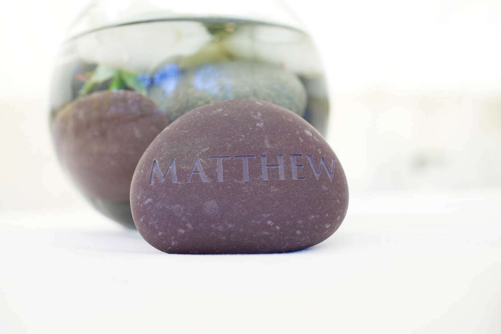 “Matt proposed in a river by a rocky outcrop and as a keepsake I took one of the grey pebbles from where we’d been standing. I used this as inspiration for the wedding, i.e. grey and round. Once we had decided on the theme I started buying wedding props straight away – collecting them up for the big day. The sooner you do this the better as it saves money and really adds the little touches to the wedding. For example, I bought lots of Christmas decorations (white china bells and hearts) in the sales after Christmas and used these in the trees at the wedding. I like little details, so I also bought lots of wedding words and signs. Again, I got a lot of these in the sales (www.sheerluxe.com has a wedding section and does lots of money off offers. Also I found wedding magazines usually have a special offer on each issue, so I used these.)”