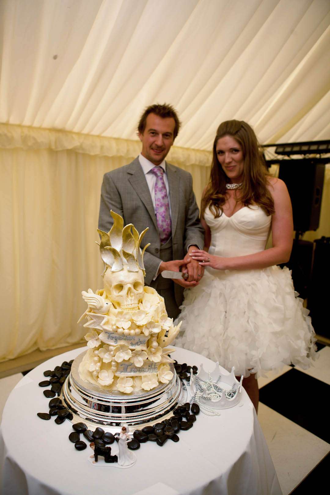Emma’s amazing dress was a custom-made Suzanne Neville number. She explains, “I never thought Matt and I would get married. I knew we’d be together forever but we weren’t really the ‘marrying kind’. As soon as he proposed, I knew my dress would be something that reflected my character. I’m not a girly girl and I usually dress in biker boots and short skirts – so short was what I wanted. I wanted to feel like ME on the day not a BRIDE. I scooted through some websites looking for a short wedding dress and found one designed by Suzanne Neville. I fell in love but hunted for something cheaper that I loved as much. Anyway I didn’t. The dress was custom made for me at a crazy price. But it was the only one for me! I’ve been taking some millinery courses so I wanted to make something for me to wear. Obviously our wedding was near the royal wedding, so as a joke I designed and made a crown out of silk and fresh water pearls to wear. In the end I chickened out of wearing it as I was already so tall in my platforms but you can see me holding it in this photo.”