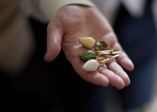 The couple also DIY’d a lot to save money including the flowers, “They were hand sewn by yours truly because we ran out of money and I wanted to have some damn flowers!” Sarah laughed. “I handmade my bouquet with fake flowers and incorporated some vintage pins in it that I’d asked for as a gift for my bridal shower. My maid of honor did flowers for many years, so she made their bouquets out of fake flowers we bought the day before at a store. They turned out so well – she took hours to glue all of the pearls to the inside of the red flowers.”