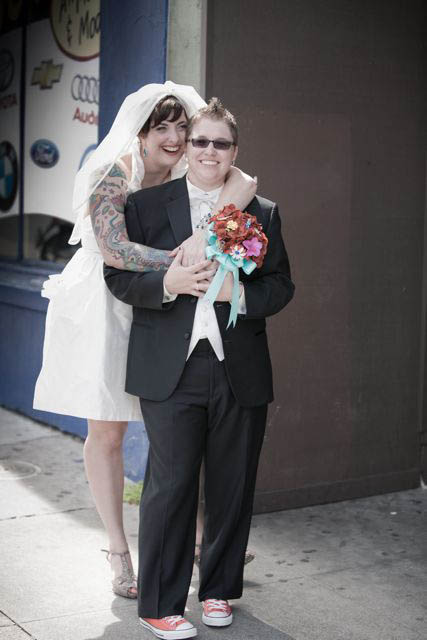 “Our wedding was Rock n Roll because it was a queer wedding first and foremost. We had so much wiggle room to shape our event to be exactly what we wanted it to be. We were able to incorporate some traditional aspects, like the ring exchange, and do away with others that had no meaning to us like a bouquet toss or smashing a piece of cake in one another’s face. Although Nat and I can’t legally get married in the state of California we’re looking forward to taking a trip to New York to do it soon! I have a full sleeve of tattoos and wanted to feel sexy at my wedding, so I opted for a short dress that showed off my sleeve & some cleavage.”