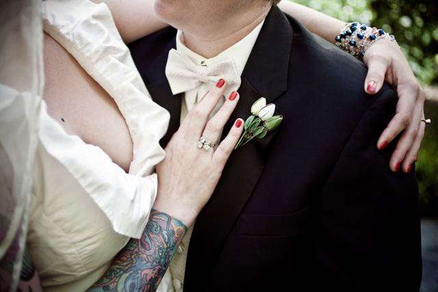 Sarah’s dress was a bridesmaid’s dress from Lula Kate which she ordered in white to save money. She also wore shoes by Jeffrey Campbell and DIY veil and jewellery. Natalie wore a hired tux from Men’s Warehouse, but to say it was a bit of a rubbish experience is an understatement.. You can read all about the drama on their blog soyourenGAYged.com.