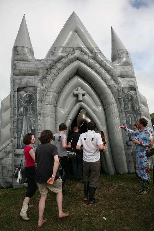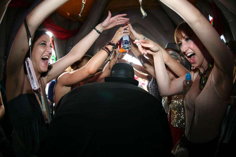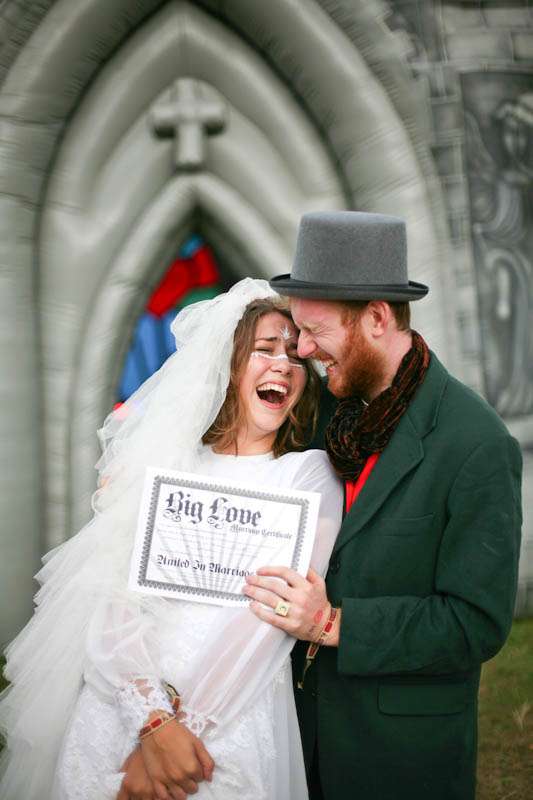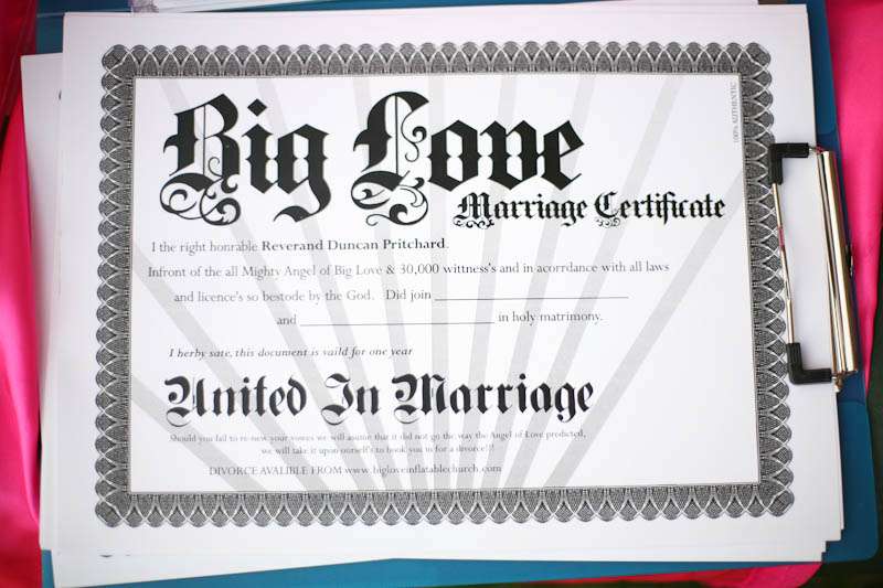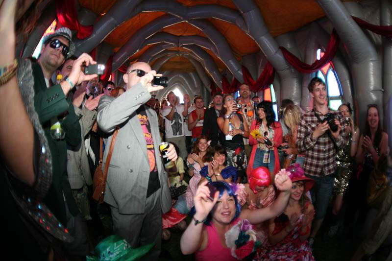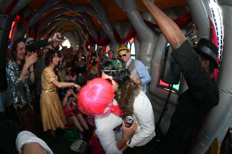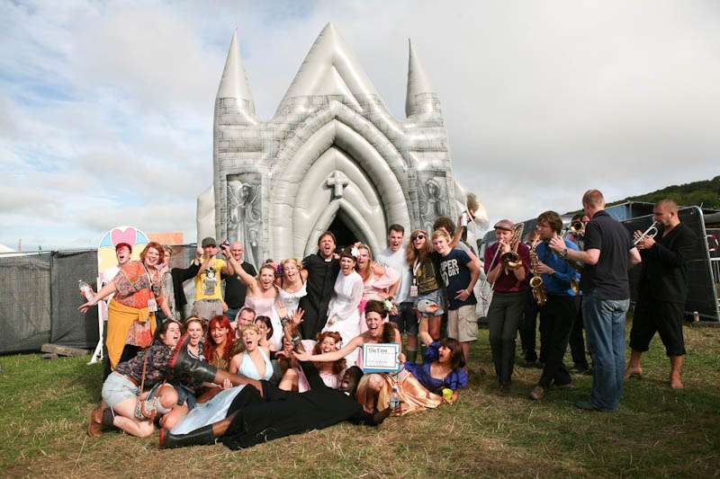 “At this point, this is where the similarity to a traditional white English wedding ends and the uniqueness of a Big Love Inflatable Church begin! The ceremonies themselves were far from conventional! The Reverend’s took it in turns to conduct each service where anyone and everyone was welcome. The congregation packed tightly into the church with the bridesmaids kneeling below the Vicar. At the end of each very risqué service music played and the congregation danced in celebration whilst the bridesmaids encouraged everyone to create an archway for the couple to exit through under their arms.The wedding certificate was then signed outside the church, whilst the bridesmaids gathered the congregation together for one big wedding photo as the group shouted ‘BIG LOVE!’.”