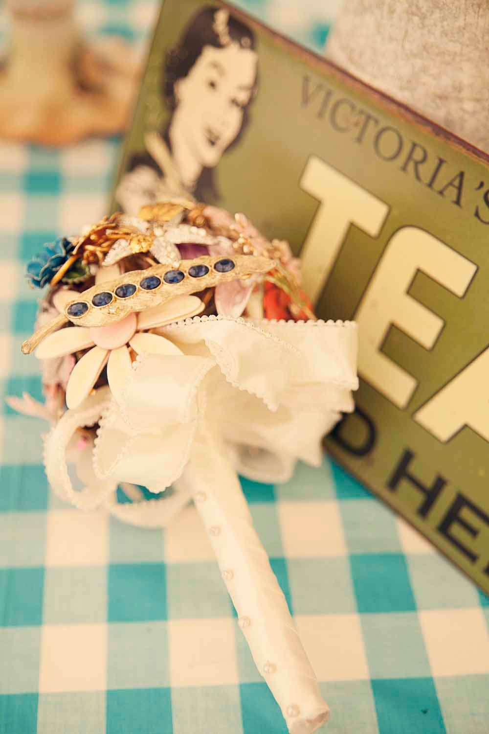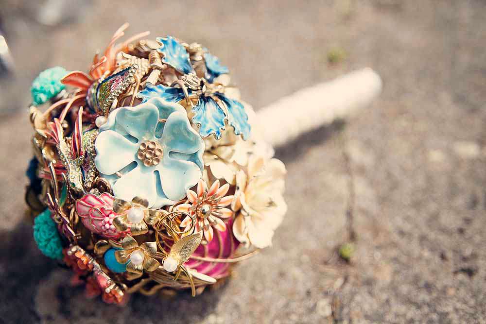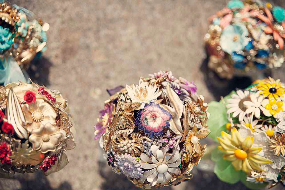 “I love everything vintage, especially vintage jewelry, I started collecting vintage brooches initially to use as the escort cards. I found so many amazing enamel flower brooches that they inspired me to use them as my bouquet. It took quite a few attempts to get it to look good, but eventually what worked the best was treating each brooch as an individual flower. I attached florist wire to each brooch by simply twisting it around the pin. I didn’t want to ruin any of the brooches, all of them can be taken off the wire and worn as a brooch.”