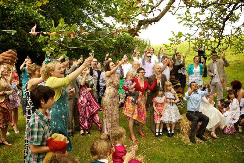 A number of the wedding attendees helped to set up the wedding beforehand hanging decorations including the ‘lollipop tree’ (lollipops bought from Etsy hung from a willow tree), vintage fabric bunting, origami birds, vintage toys and games, wildflowers and Victorian birdcages (be sure to check out all the amazing details in the gallery below!)