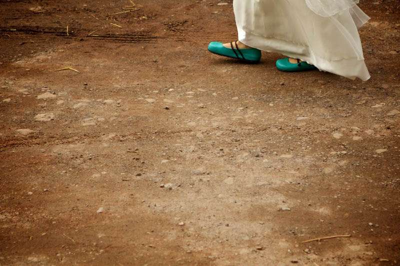 The bride wore a dress found on eBay £80 which she pimped with the help of her best friend Sarah. The applique swallow was an antique beading decoration found at a flea market and the flowers and beads were also vintage, sourced from Kempton Market. They also added turquoise cord to match the brides shoes.