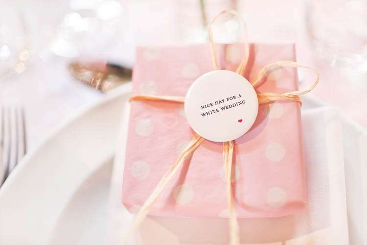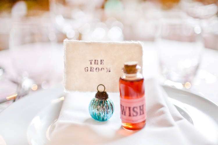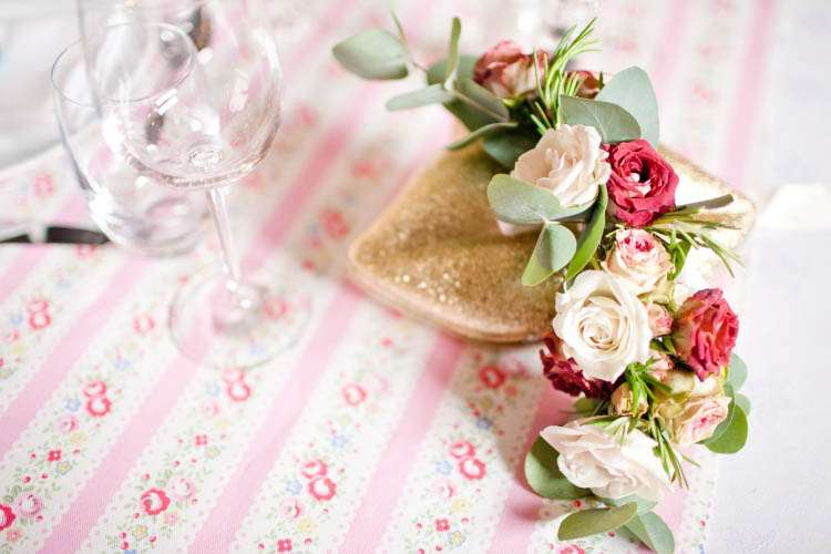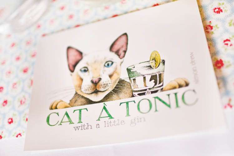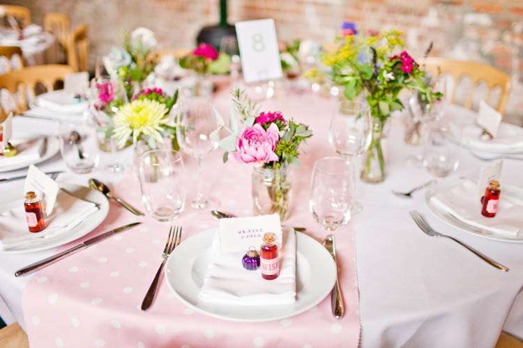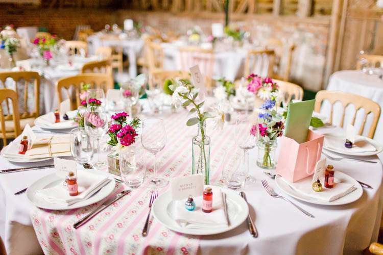 “We made our own gin favours by making blackberry and pear gin – (mix equal parts fruit, sugar and gin then leave in a cupboard rotating occasionally, for three months) then had loads of fun gotgineverywhereandgotprettydrunk – pipette-ing gin into mini bottles we got from Hobbycraft and making them look cute with wish labels,” Mads continued when I asked about any DIY elements in their wedding. “I also made my own runners using Cath Kidston fabric so our tables were colourful. They weren’t perfect, the edges were cut using pinking scissors and weren’t ‘finished’ which meant they did they fray, but I honestly don’t think anyone noticed/cared!”
