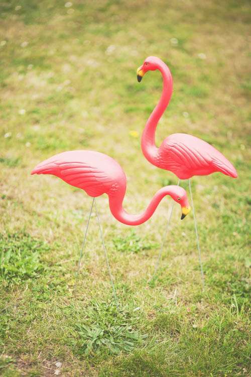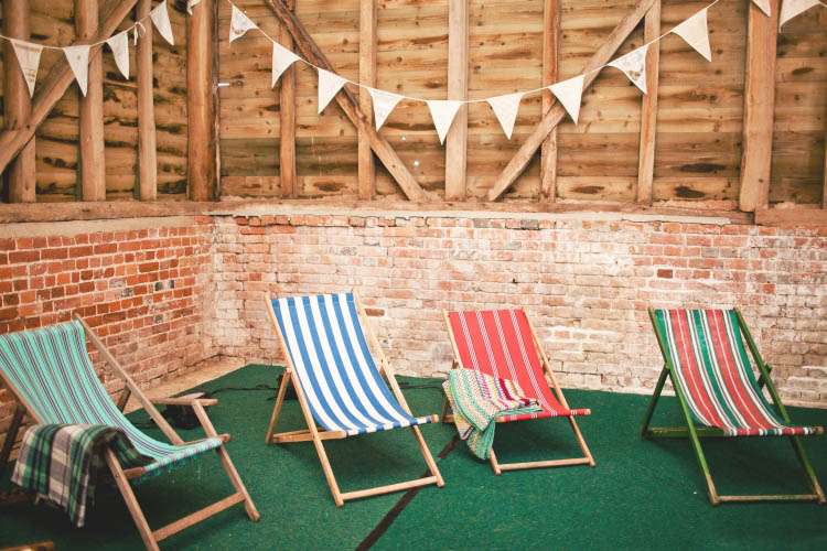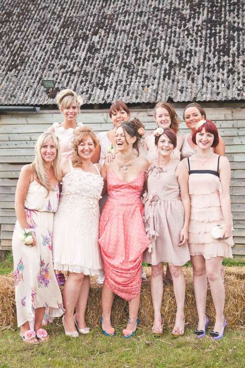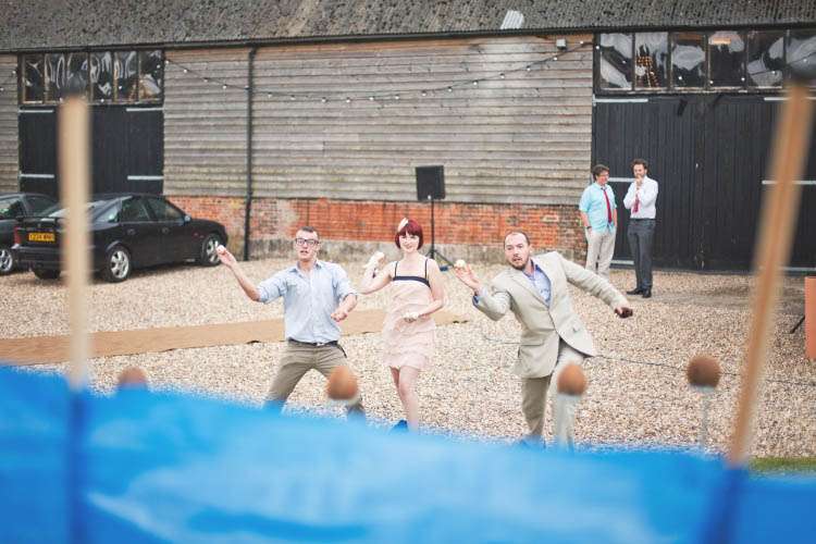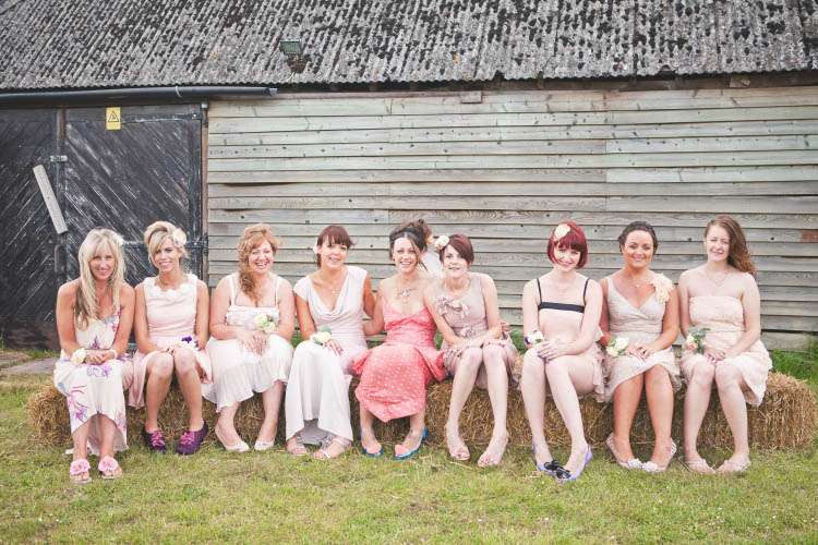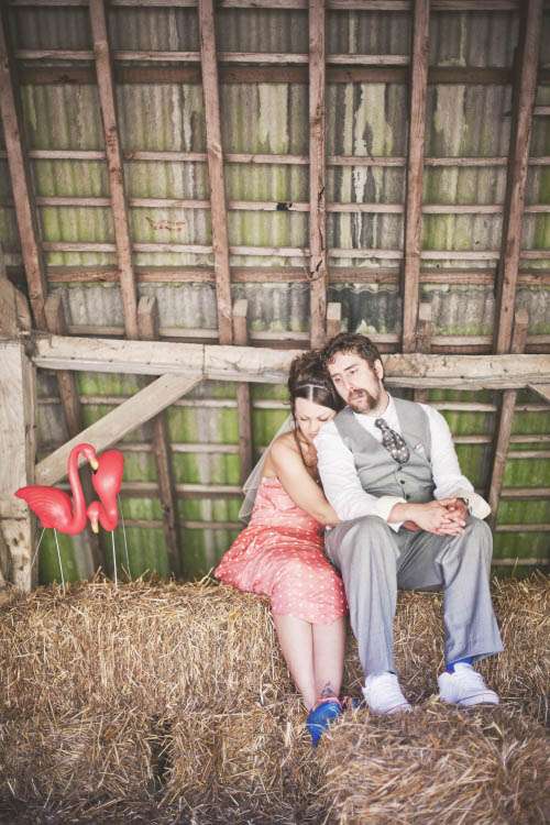“From the pre-ceremony music being a collection of our favourite film scores (How to Tame your Dragon anybody? Ahh just me and Nick then), to the inadvertently weepiest of readings; eight dreamy looking bridesmaids and nine hot groomsmen and our tables being named after ‘Our favourite things’ (inc Midsomer Murders and Arnold ‘The best activities for your health are humping and pumping’ Schwarzenegger – we had no shame!). We had our friend on guitar after dinner, photos in front of an abandoned concrete barn instead of the lake, pink flamingos, a Lulu Guiness corsage bridal ‘bouquet (instead of a traditional bouquet)’, funk and films on in the evening – who doesn’t want to watch Predator in a deckchair under a blanket with a Pimms on the go? Then at the end of the night we stole a taxi, ate cake and I got to take my spanx off. Rock n Roll!”
