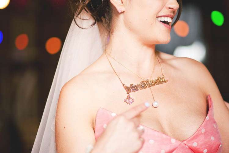 Bride’s Jewellery: Catherine Jones (wedding ring and pearl necklace), Eclectic Eccentricity (earrings) Tatty Devine (name necklace) Fluffstuffs (‘I DO’ necklace)