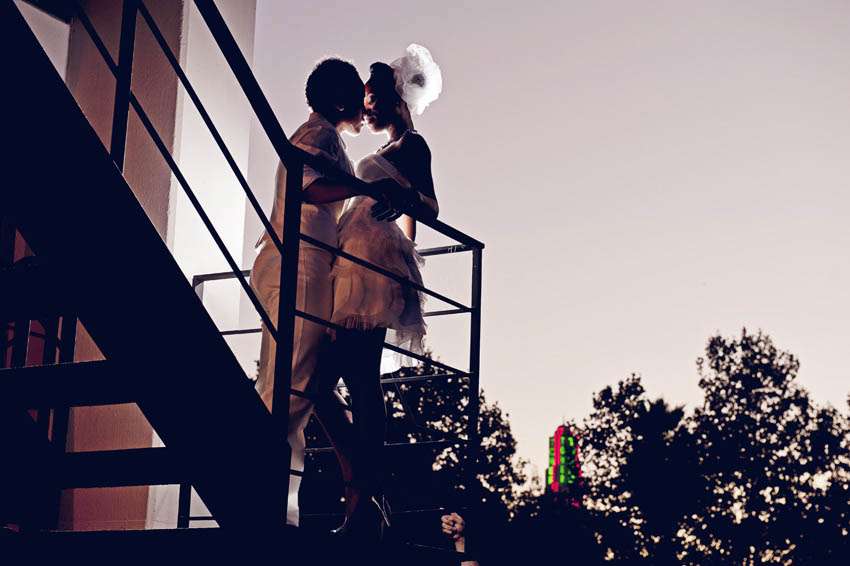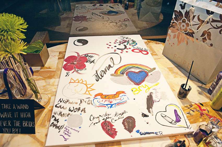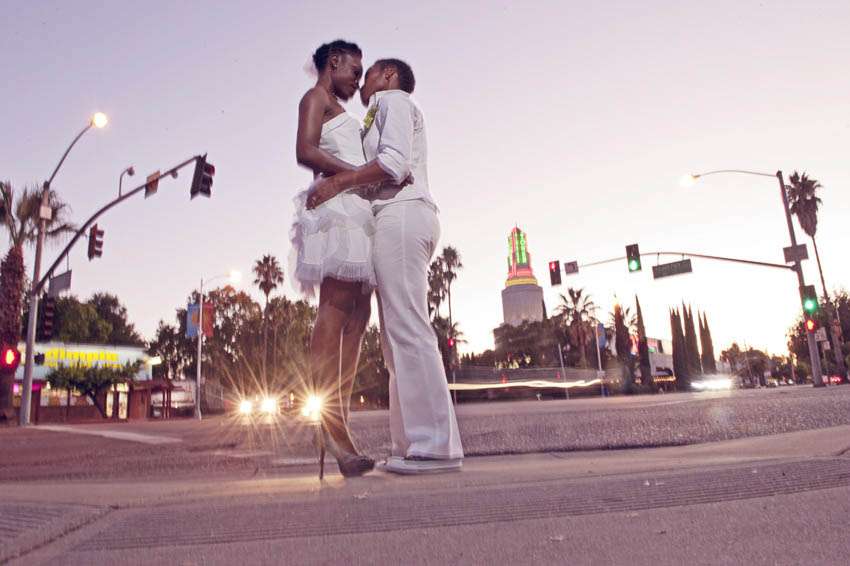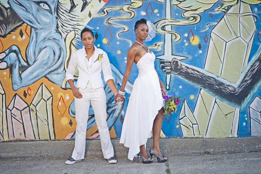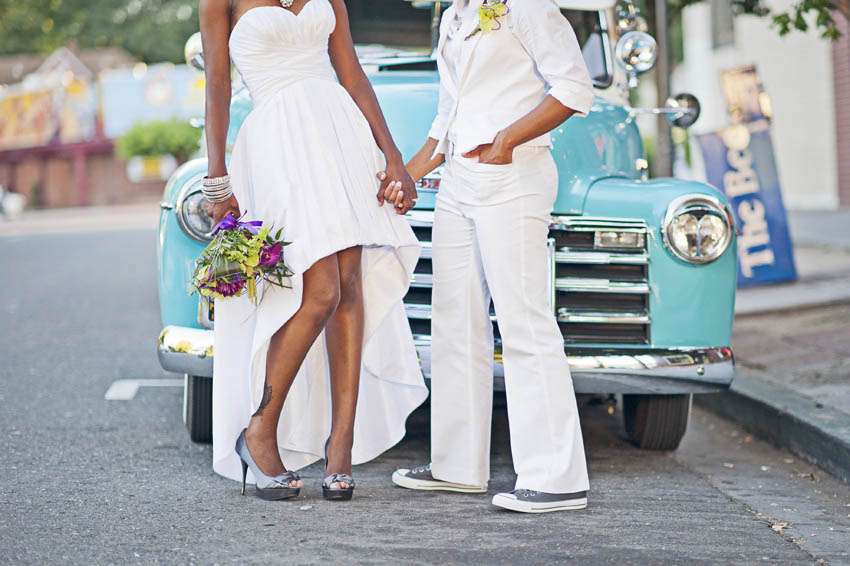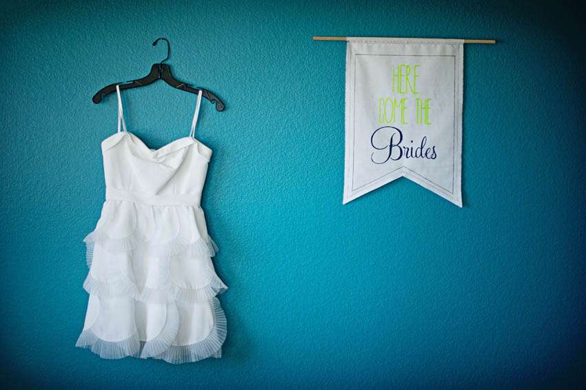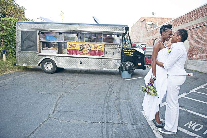 “My dress was my design as well. I found a style that I liked from WToo and edited to my specifications with the help of the designers at the bridal shop. I wanted to wear designer jewelry, but knew I could never afford it, so I borrowed it at a fraction of the cost, only $40 for the week from Bag Borrow or Steal! My wife’s ensemble was much more difficult because she didnt want to wear a man’s suit so it took us a while to piece together her wedding day garb. In the end our wedding day was full of love, beauty and creativity. From the venue, to the taco truck, to the attire, to the photography, I’d say our wedding was a breath of fresh air when compared to your traditional wedding. I’d say that’s pretty darned Rock n Roll!”