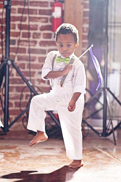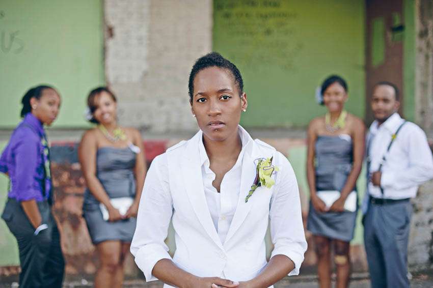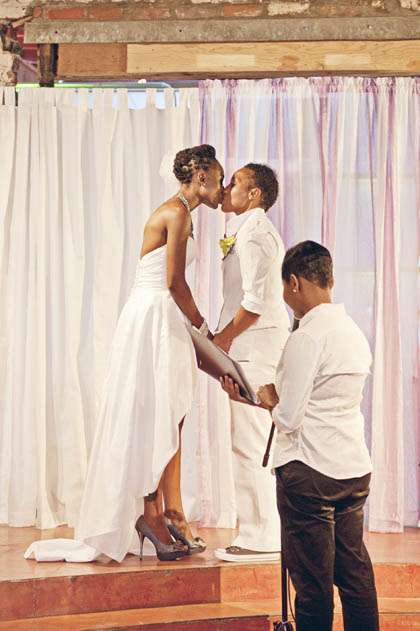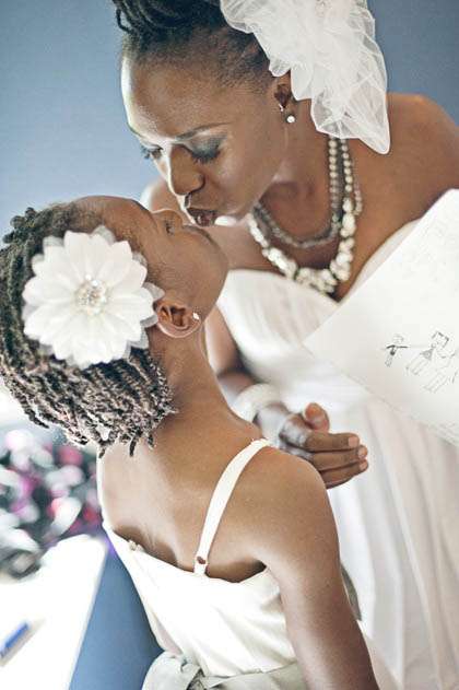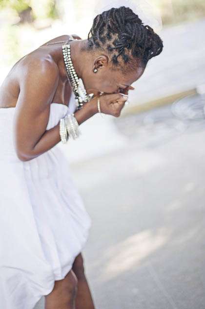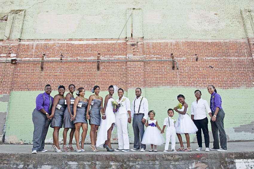 Shavonda & Naomi both wore white for their elegant but funky wedding in Sacramento, CA. Shavonda actually wore two dresses – the first, a customised gown from WToo (loving the short front!) and for the reception a sexy short number from BCBG Max Azria. Naomi’s suit was a mix of trousers from New York & Co, a vest from Bebe and a shirt from Express.
