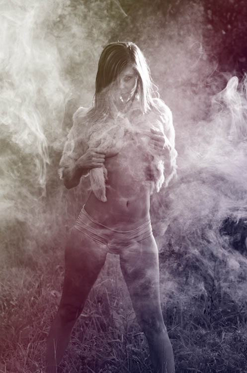 The inspiration for the shoot was “a crazy, psychedelic, Rock n Roll, fantasy dream,” explained Nikita. “Inspired by 60′s and 70′s music and the feel of old album covers, I wanted this shoot to be wild and hot. Casey was so awesome! She got my vision completely and dug out some amazing pieces from her own wardrobe…. the smoke is actually from left over smoke bombs I had from Independence day.”