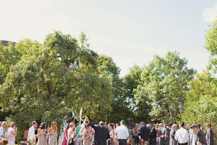 “The decoration was all hand-made and here are some of the things we did…My Sisters sewed metres and metres of bunting and collected bits of lace which they used to decorate the pear tree under which we got married. My Dad and Julien’s good friend put up all the lighting and lanterns, my close friend and my Brother’s in Law created wreaths and put up hundreds of fairy lights in the trees. We washed and wired loads of jam jars which were hung from trees as candle lanterns.”