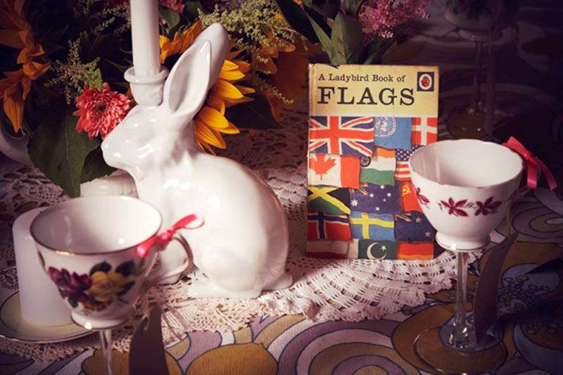 There were so many DIY elements of this wedding, as the couple continued to explain, “All the invites were handmade, handkerchiefs stamped with the details wrapped in a doilie posted with a portrait stamp of the bride and groom. We also made the teacup chandelier hovering over the top table. The cake table was brought together by several guests bringing their own cakes to share although the main wedding cake nearly got eaten before it had even been cut!”