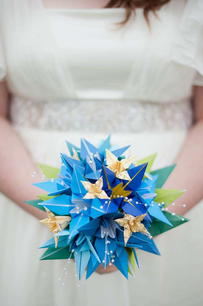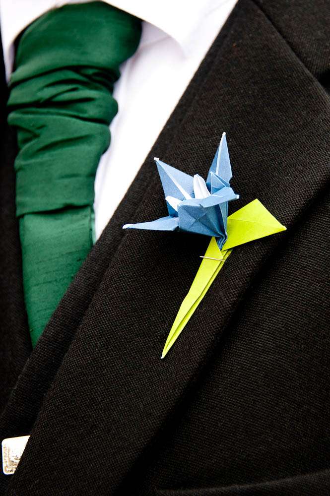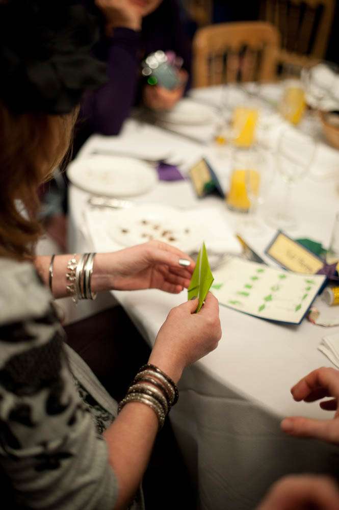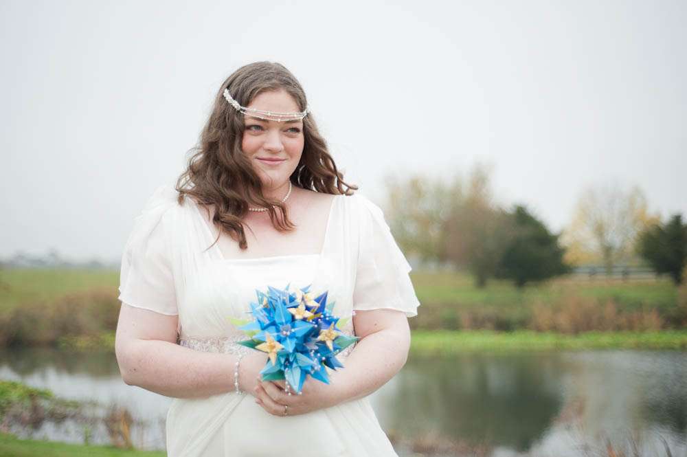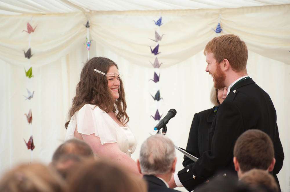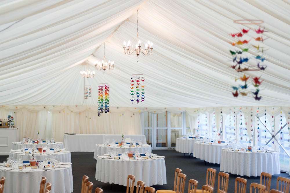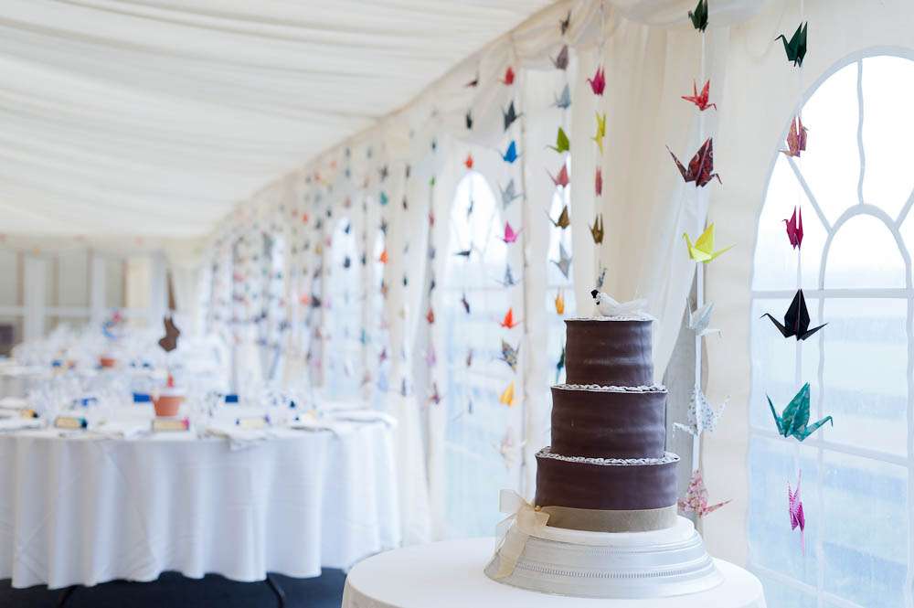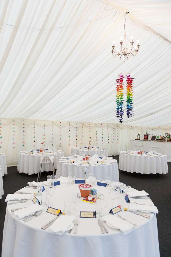“A few weeks after we had booked, we got the call – the barn had burnt down. Ah. So, onto plan B. We saw the marquee which was put up in place of the barn, and liked it – it was light and airy, and still had all the things about the location that we had loved initially. The only problem was that, whereas the barn was full of its own character, the marquee would definitely need decorating. We spent a lot of time going for walks and kicking ideas about, until I remembered the Senbazuru – an ancient Japanese legend promises that anyone who folds a thousand origami cranes will be granted a wish. It is a traditional wedding gift, or something done together by the prospective husband and wife to prepare them for married life together – it does take a lot of time and patience. I love origami, but Terry had to learn – which he did, and the next few months were spent folding cranes together in the evenings. We also went on to fold tiny cranes for all the place cards, and decided to carry the theme through, picking origami animals to be our table names and I even folded my own origami bouquet.”