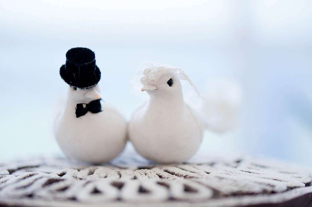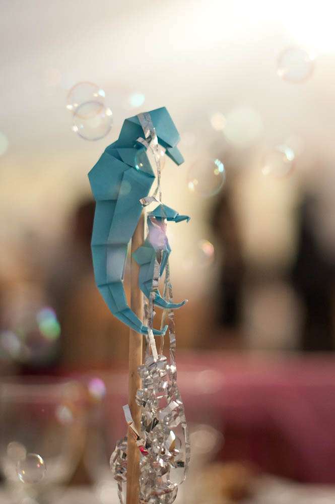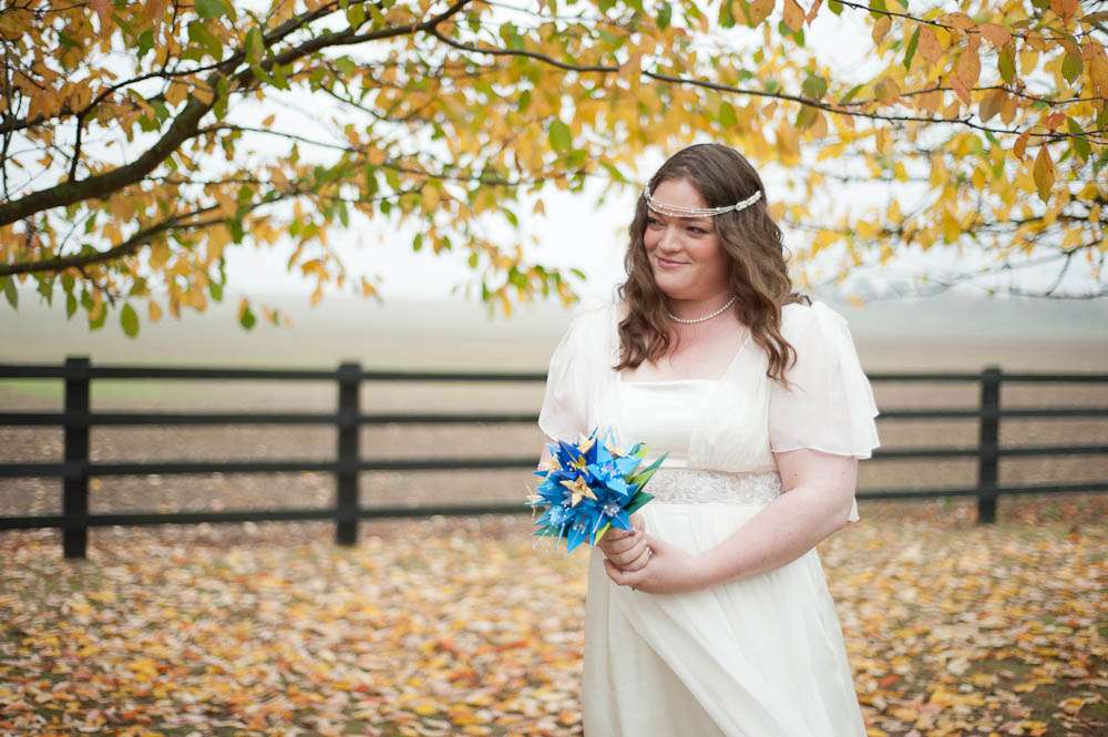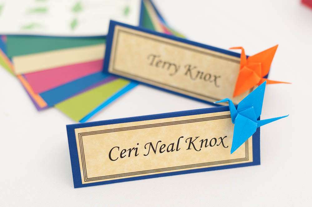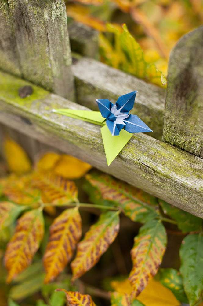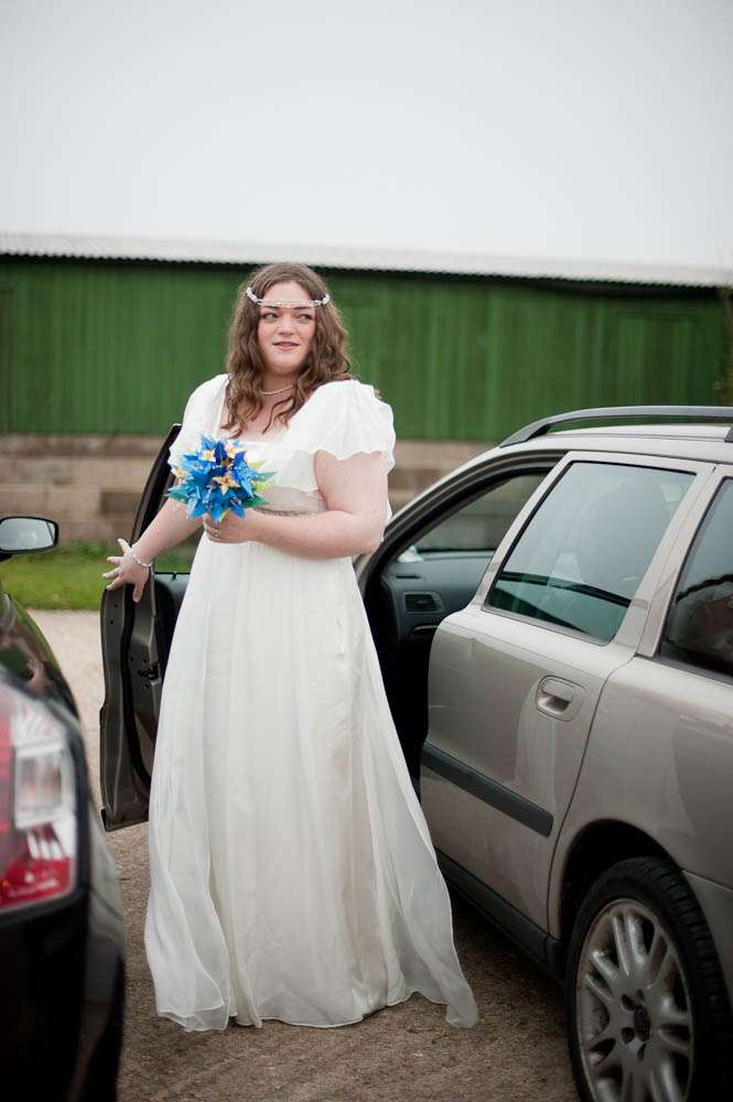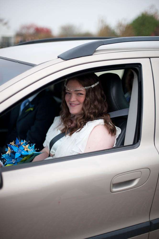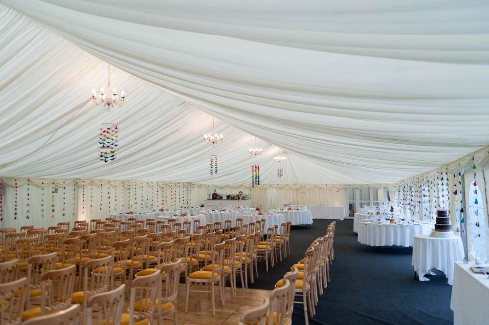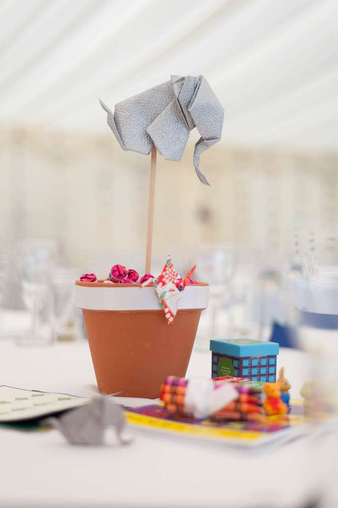 “A few weeks after we had booked, we got the call – the barn had burnt down. Ah. So, onto plan B. We saw the marquee which was put up in place of the barn, and liked it – it was light and airy, and still had all the things about the location that we had loved initially. The only problem was that, whereas the barn was full of its own character, the marquee would definitely need decorating. We spent a lot of time going for walks and kicking ideas about, until I remembered the Senbazuru – an ancient Japanese legend promises that anyone who folds a thousand origami cranes will be granted a wish. It is a traditional wedding gift, or something done together by the prospective husband and wife to prepare them for married life together – it does take a lot of time and patience. I love origami, but Terry had to learn – which he did, and the next few months were spent folding cranes together in the evenings. We also went on to fold tiny cranes for all the place cards, and decided to carry the theme through, picking origami animals to be our table names and I even folded my own origami bouquet.”