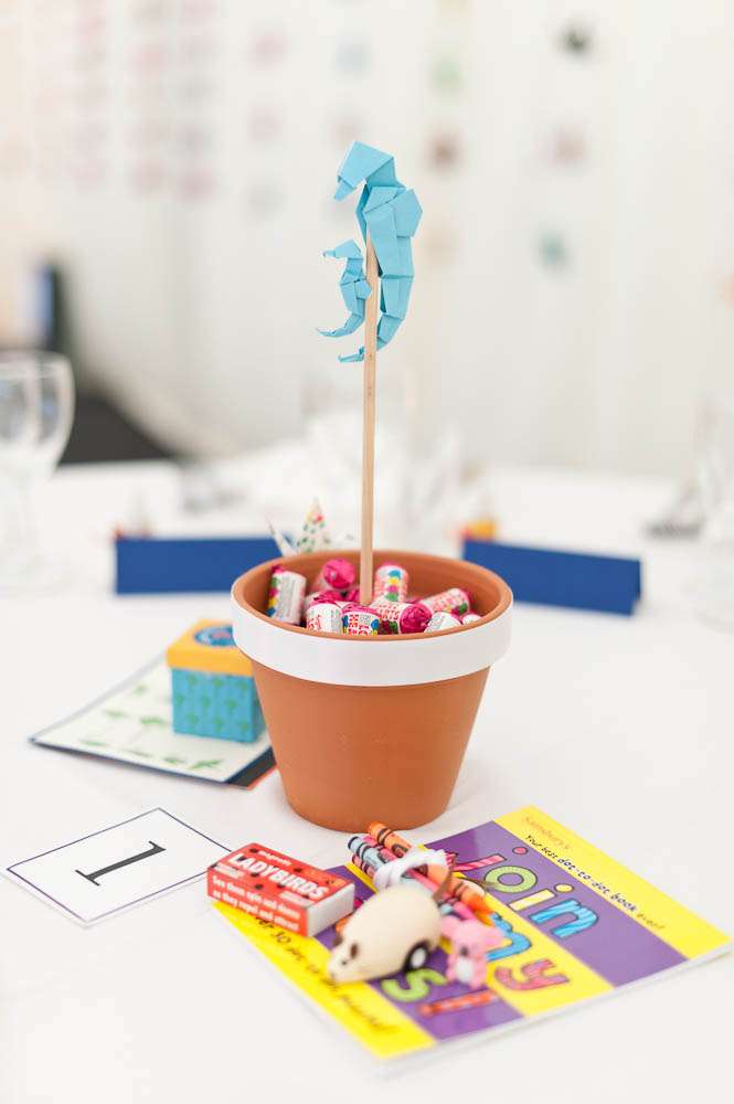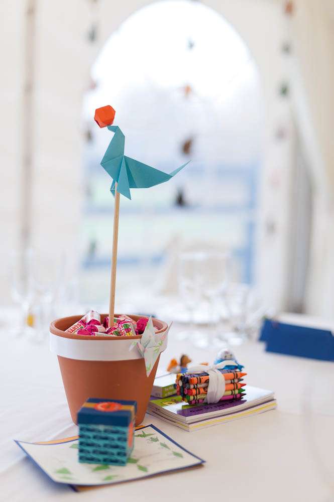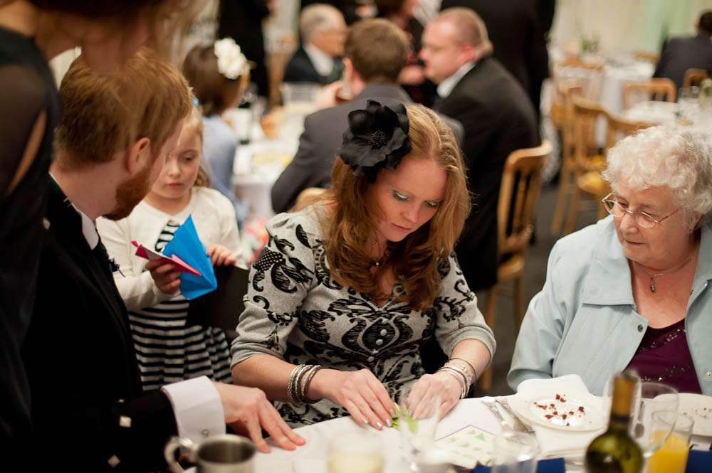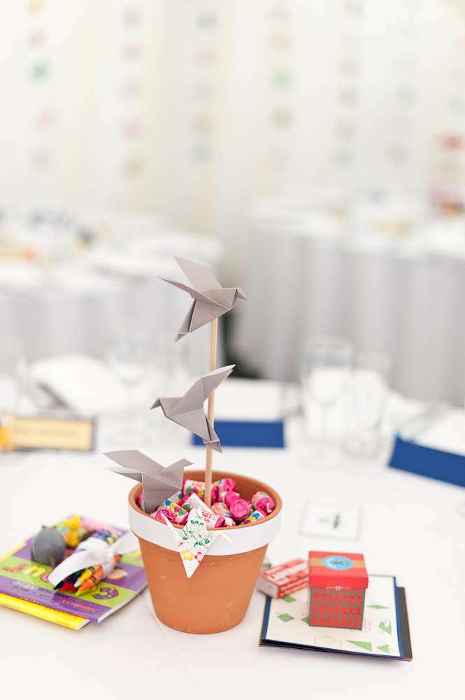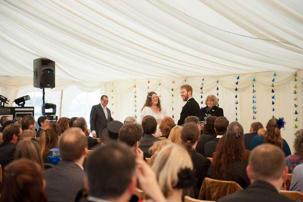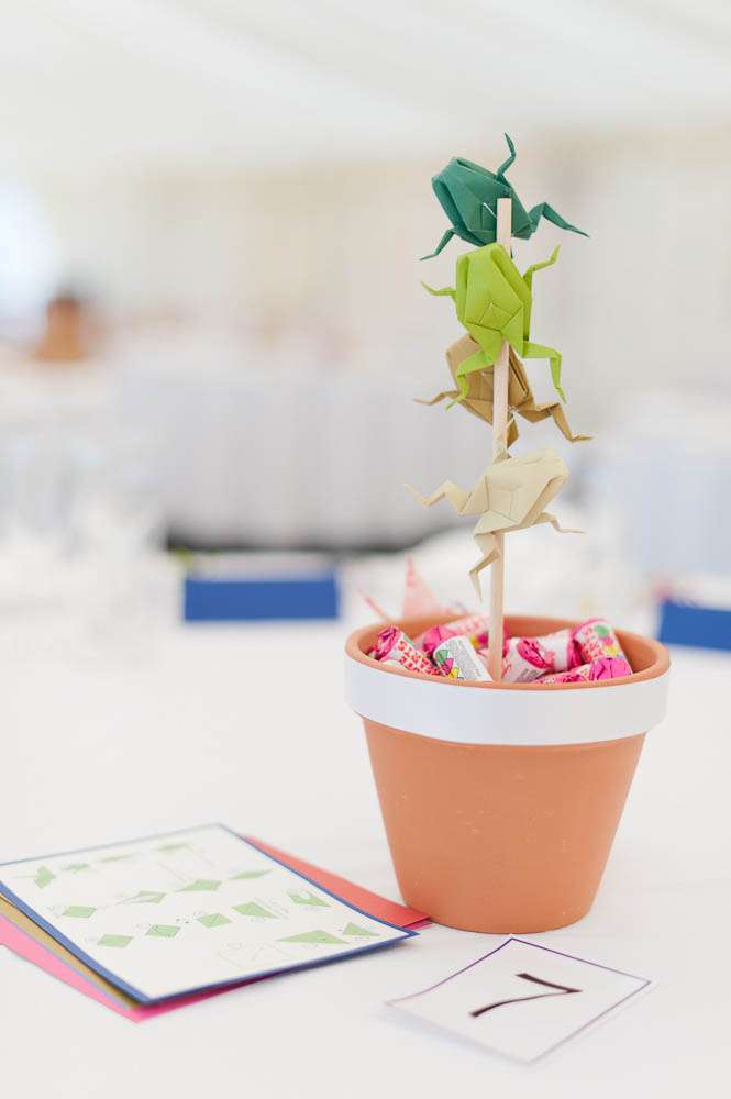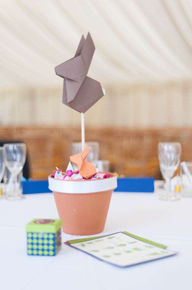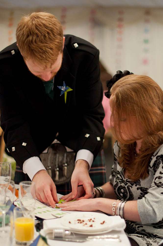 “The thing which we found most difficult about planning a wedding was the assumption from other people that things would always be done a certain way,” the bride concluded. “We wanted to start from scratch and do things because they felt right, rather than just because they were traditional. Our two best friends are guys, so no bridesmaids, but two best men. Because the marquee wasn’t licensed for weddings, we were legally married in a very small, very quick ceremony in the billiard room, and then had a public ceremony in front of all our guests, so we personally adapted both ceremonies to make them right. Neither of us were particularly interested in wedding flowers – so we didn’t have them, using flower-pots filled with Love Hearts to stand our origami animals up in in the centre of each table.”
