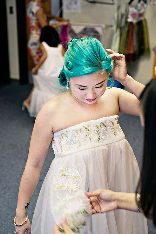 The bride’s ceremony dress was based on a traditional Korean hanbok style with a jacket. Then, for the reception at North Bank Pavillion, Esther changed into a multicoloured shorter style dress, The reception dress was in the traditional hanbok colours and I hand dyed all the fabric but it was in a short length without a jacket and striped on the skirt instead of the traditional sleeves.”