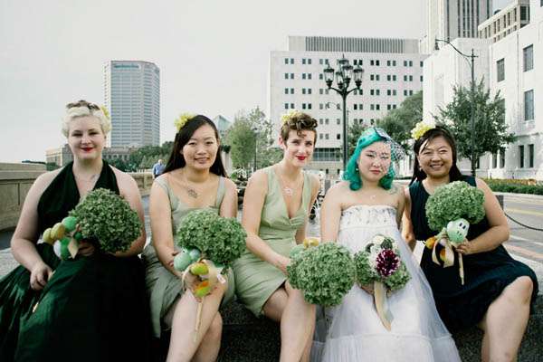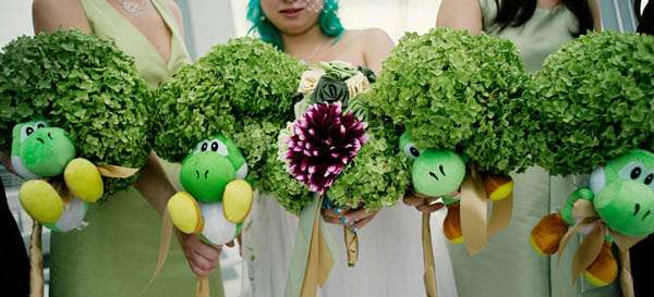 Their reception was a mix of nerdy and cool. They had a Yoshi theme throughout including in the brides and bridesmaid bouquets, the stationery and the wedding cake. “There was so much DIY in the wedding, it would be difficult to share them all. I think the biggest challenge was the Jellyfish decoration for me. I went through several failed attempts from huge handmade crochet doilies to trying paper mache strategies with huge play balls and tulle. I finally ended up using round paper lanterns from China town.”