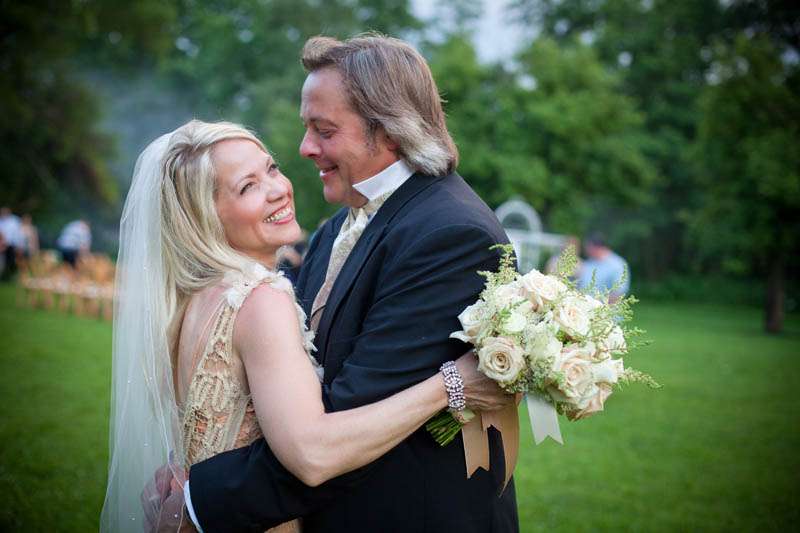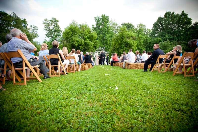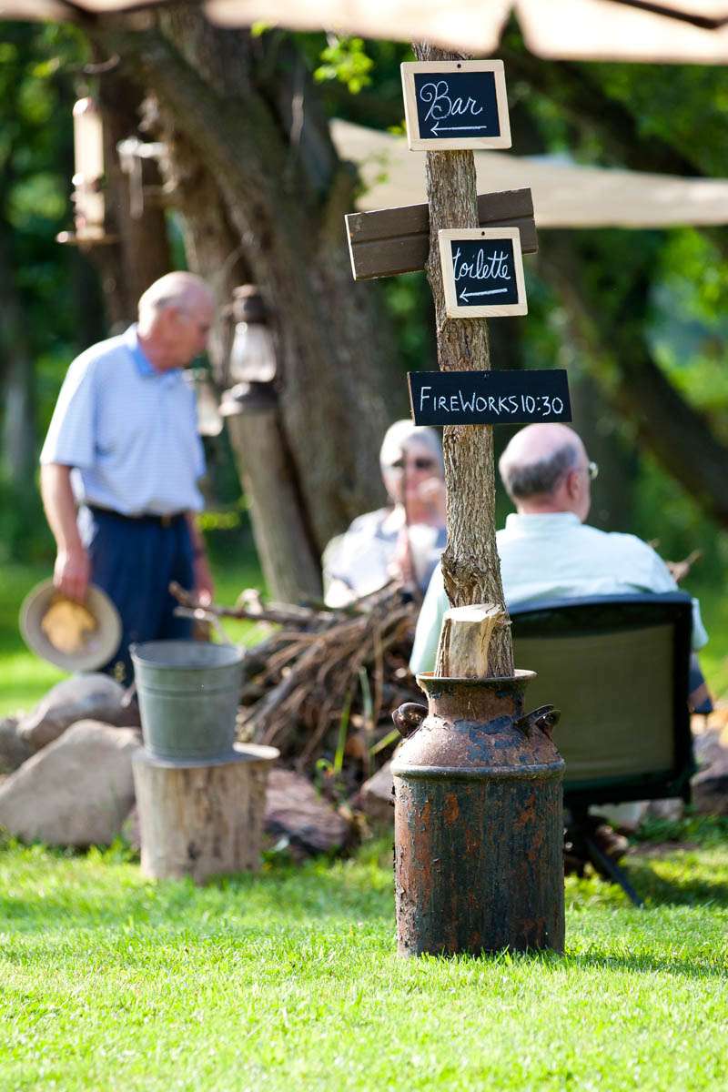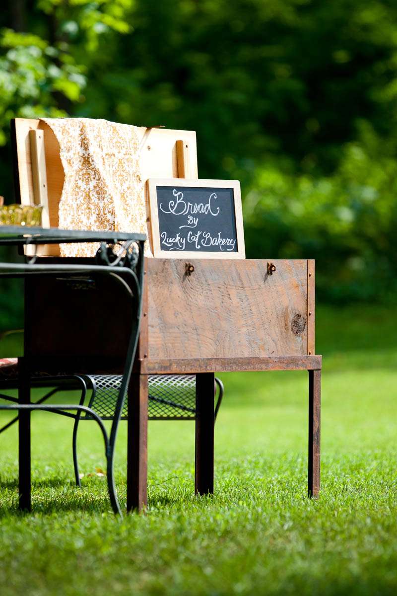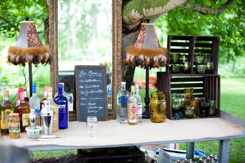 “We had a bar under a maple tree where we used a vintage wood bar and stools lighted with globe lights and feathered lamps,” continued Bethany. “The gazebo was an iron structure from Mexico that Eric gave to me as a gift before the wedding. We used hay bails from our farmer neighbor topped with oak planks from a local mill for our ceremony seating.”