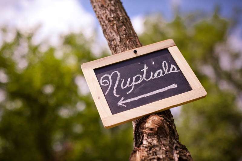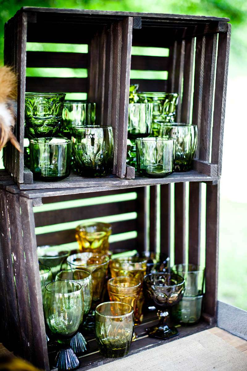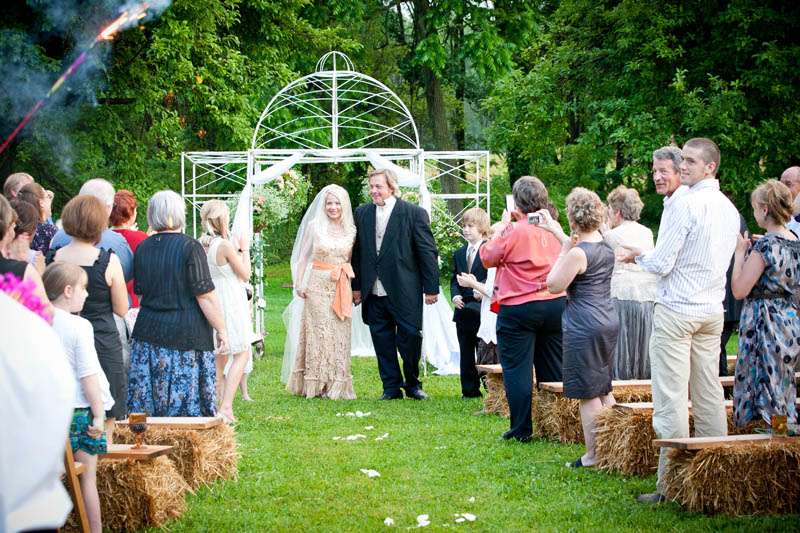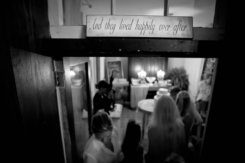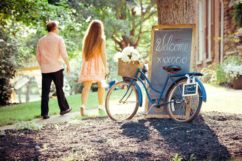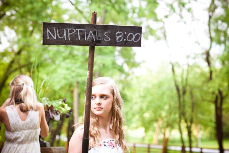 “We had a bar under a maple tree where we used a vintage wood bar and stools lighted with globe lights and feathered lamps,” continued Bethany. “The gazebo was an iron structure from Mexico that Eric gave to me as a gift before the wedding. We used hay bails from our farmer neighbor topped with oak planks from a local mill for our ceremony seating.”