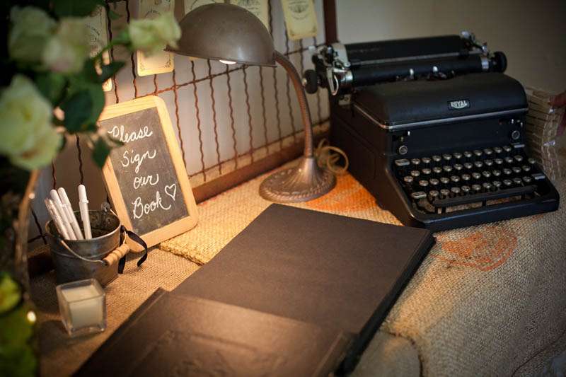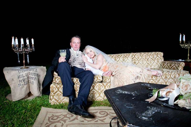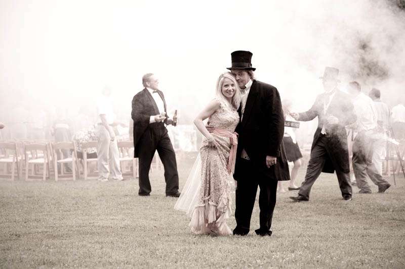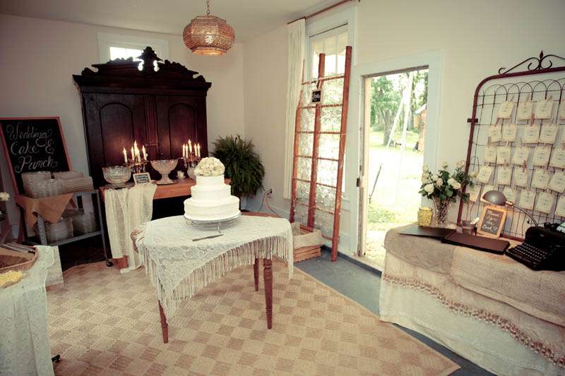 The theme may have started with their home but over time ‘a day and night at the fair’ became their manifesto. Royal Steamline provided the perfect stationery to fit the idea. “We wanted to create a vintage carnival feeling for all ages of guests to enjoy,” the bride continued. “I have an antique and interior design business named after our home, so I incorporated many antique and vintage items, furniture and props to create the scene. I searched auctions and estate sales for real vintage goblets, punch cups and plates for our guests to enjoy. I used vintage furniture outside to create a living room area that was a fabulous photo booth for all of our guests as well as the bridal party.”