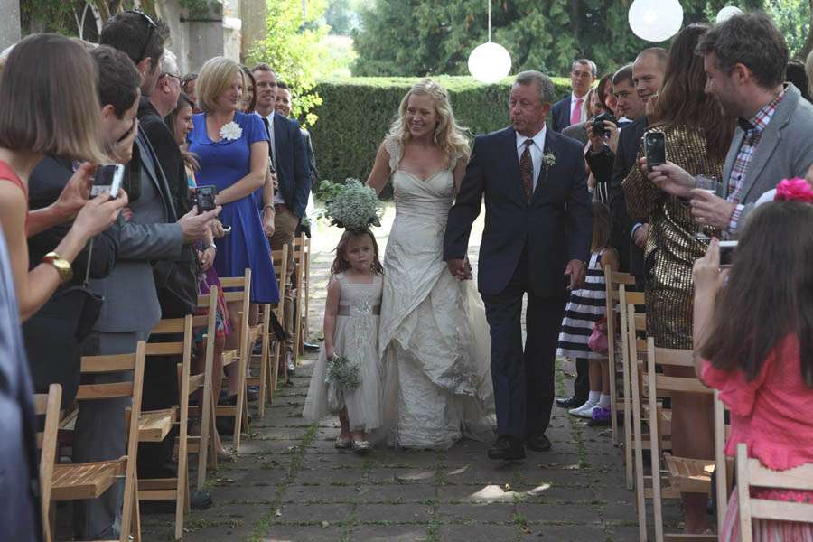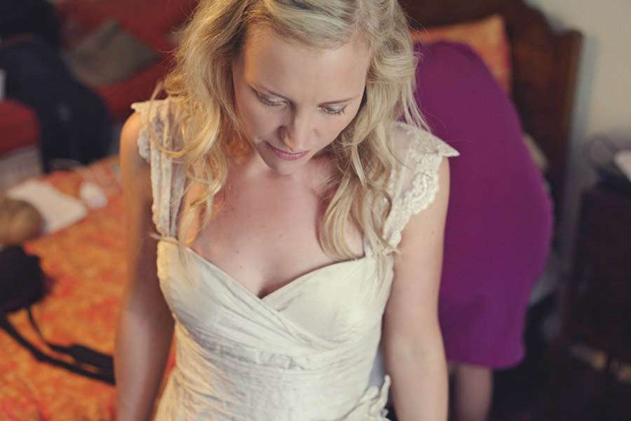 The bride wore a stunning Linea Raffaelli wedding gown which she bought second hand from a friend and customised by adding antique lace straps. “When we decided to get married my now Sister-in-law mentioned that a friend had a dress for sale,” Kelly explained. “I had seen a picture but wasn’t sure it was right for me but thought I should go along and try it as everyone said you should try all styles. When I tried it on I was really surprised how much I loved it as it was nothing like the image of the dress I thought I would wear. The dress was originally strapless but with 3 young children I just wasn’t sure it would work, so chose to have straps added. I met with a lovely local dressmaker and worked with her to choose the style of strap. I now think the antique lace straps made the dress and I love the fact that I was able to make it my own with it being a 2nd hand dress! I vowed to make the most of being in my dress as you only get to wear it once and said right from the start I wouldn’t be precious about wearing it. With the bonfires and camping it was a good job! I even ended up sleeping in it in our tent!”