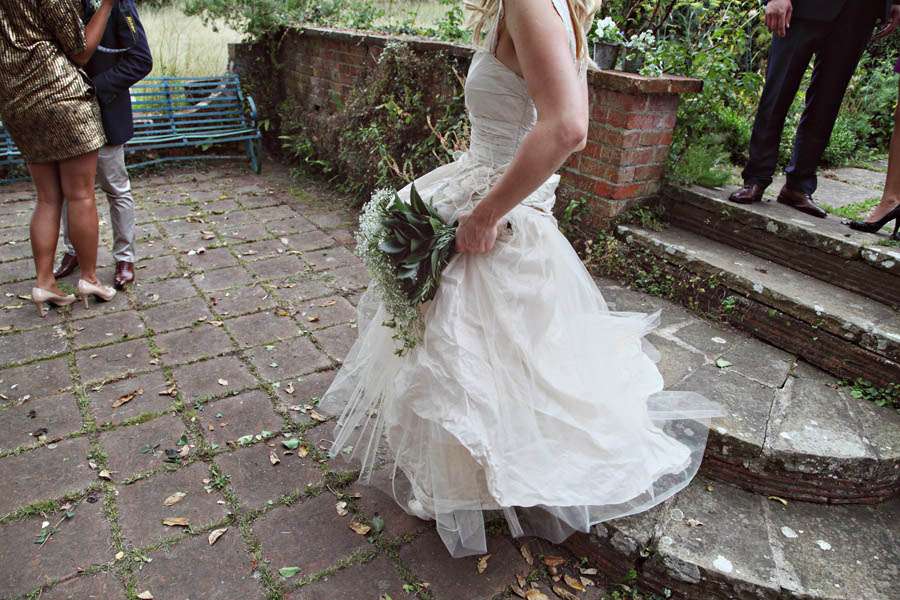 After the ceremony, the wedding guests were treated to a delicious meal of local produce. “James works in the catering industry, running a local restaurant – which is actually where we met, so the food on the day was really important to us. Right from the start we wanted a meal that was relaxed, could be shared, and passed around to get our guests chatting. We wanted to move away from the formal fussy sit down. We chose to have 3 long tables rather than a number of tables as we loved the idea of a banquet/feast! We were fortunate enough that his boss helped us with the catering and put on an amazing spread of food, not only in the day but also the evening with large roast joints of pork on the open fire, chicken & lentil dahl & falafel flatbreads.”