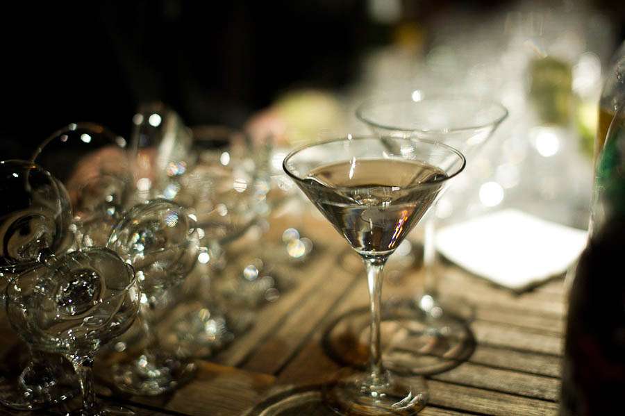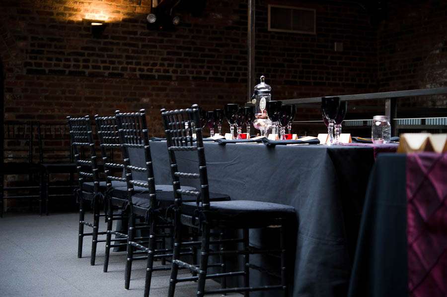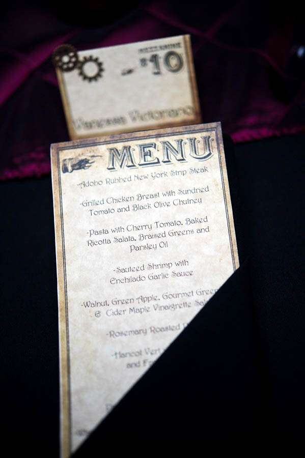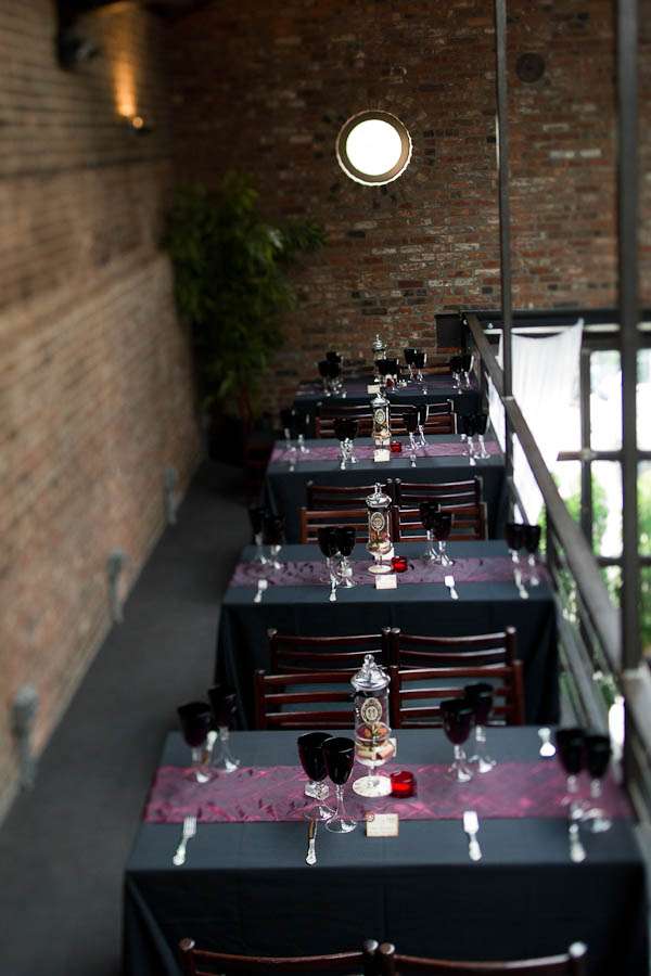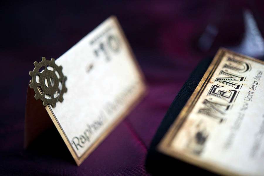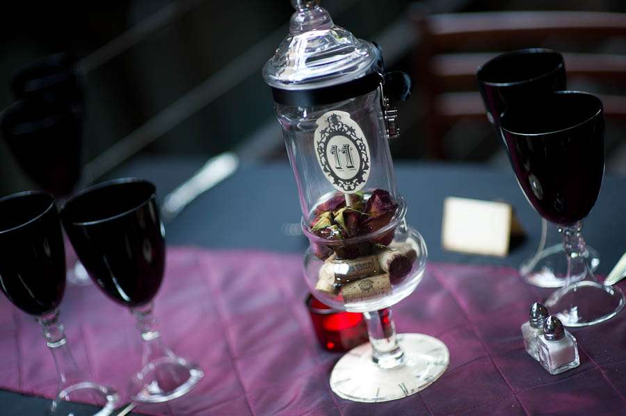 The reception was held in the main hall at The Foundry. “Our centerpieces were made by us,” the bride explained. “We collected wine bottle corks and dried out lots of red roses upside down on a laundry line at home at least 3 weeks before putting them all together. The tops of the apothecary jars had a black ribbon tied around with a different steampunk and vintage-themed trinkets attached.”