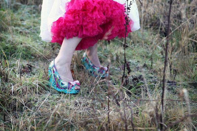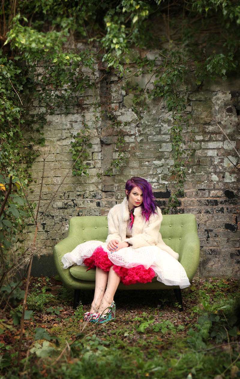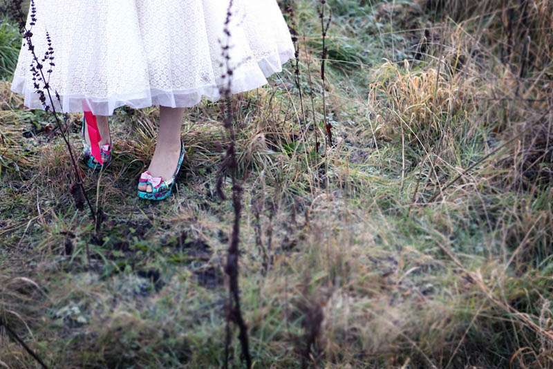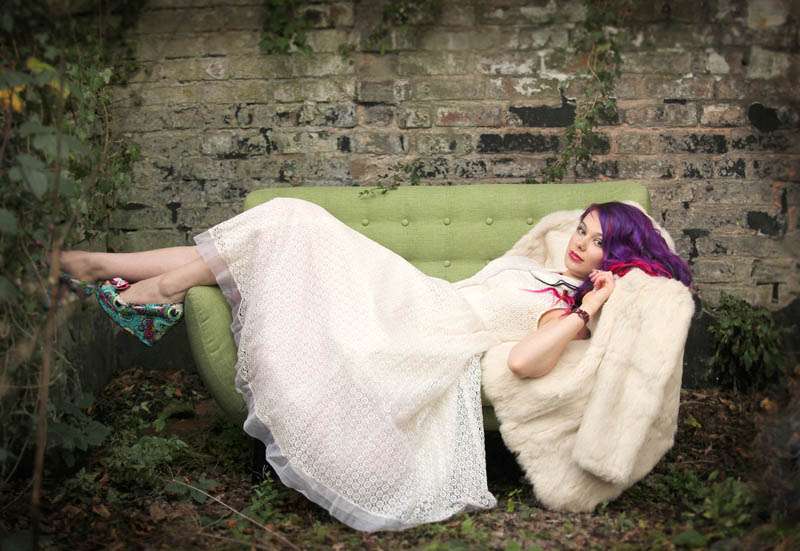 “I love Becky’s purple hair and that was the starting point for my theming ideas. I warned her that we would be spending most of the day shooting outside and promised cake to make up for it, but I have to say she was an absolute star, sitting in the freezing cold in a little dress and peep toe shoes. The thing about bridal shoots is that often there is zero budget to pull them together, so again I sent out a few emails and found some amazing people to work with who loaned us items for the shoot.”