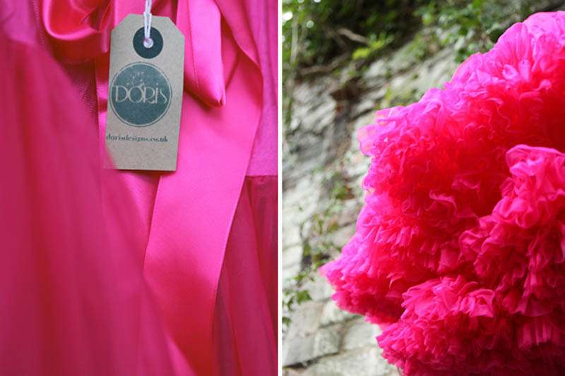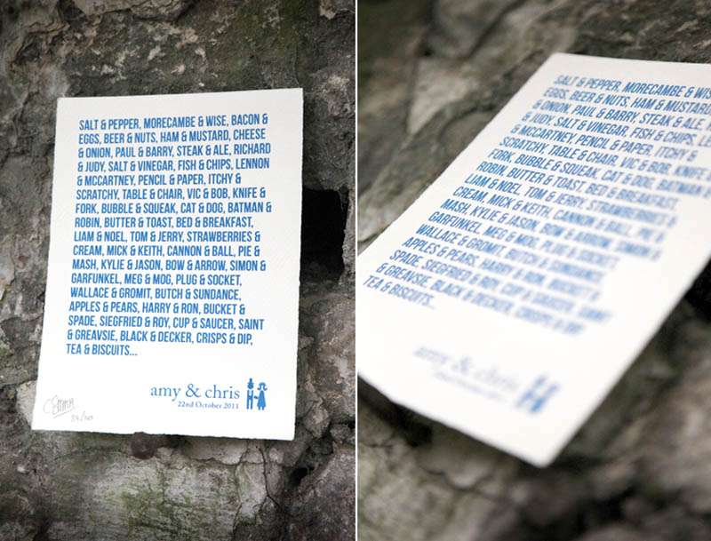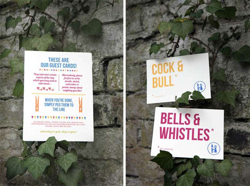 “The stationery was hand printed by Chris Smith who runs his own company called One After Nine. He specialises in simple and bold graphic design and typography while using methods such as screen printing and letterpress to produce the work. The dress and coat were borrowed from Lucky Bitch Boutique, who sell a mixture of original vintage items and hand made jewellery and accessories. Doris Designs loaned a kick ass hot pink petticoat to really bring the dress to life.”