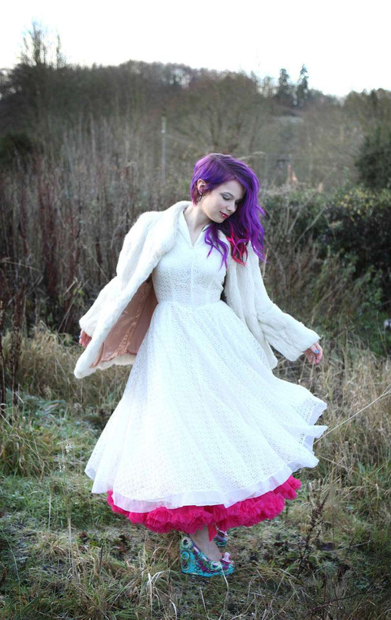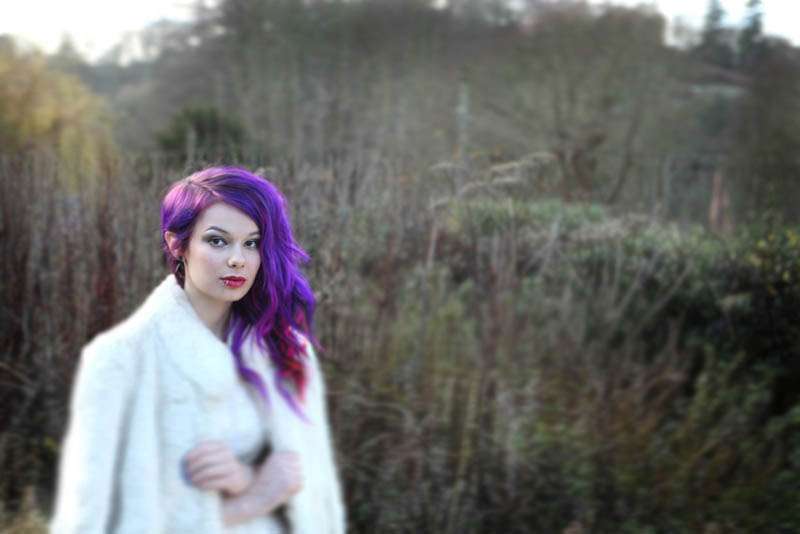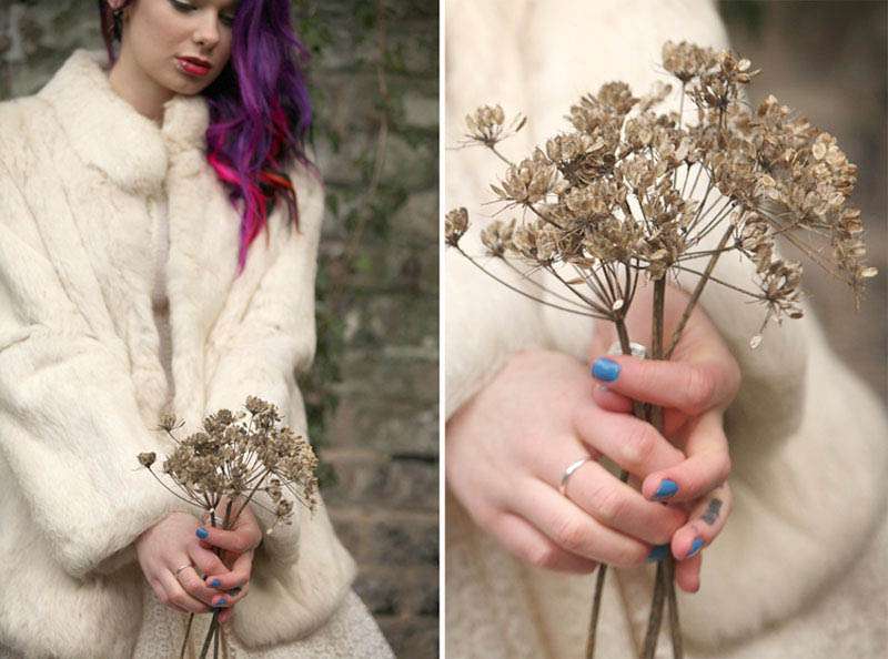 Becky’s bridal shoot was the brainchild of wedding photographer Bethan Haywood Jones. She found Becky online and loved her look (hello, purple hair!) and so approached her with the idea of a winter themed shoot. “Aaaaah, winter. I’ll be honest, I’m not a big fan on the whole!” Bethan explained. “It’s cold, it’s dark, most things appear to be dead and it rains a lot. However, the winter weddings I am lucky enough to shoot are usually bursting with love, life and enough warm things to make your toes feel toasty. So my inspiration for this bridal shoot was to show that even on the greyest of days it isn’t too hard to inject a bit of colour into your day.”