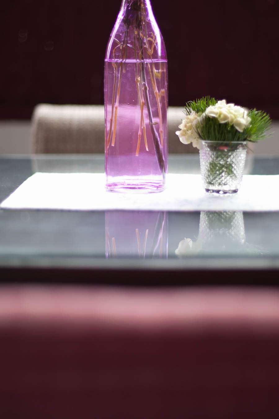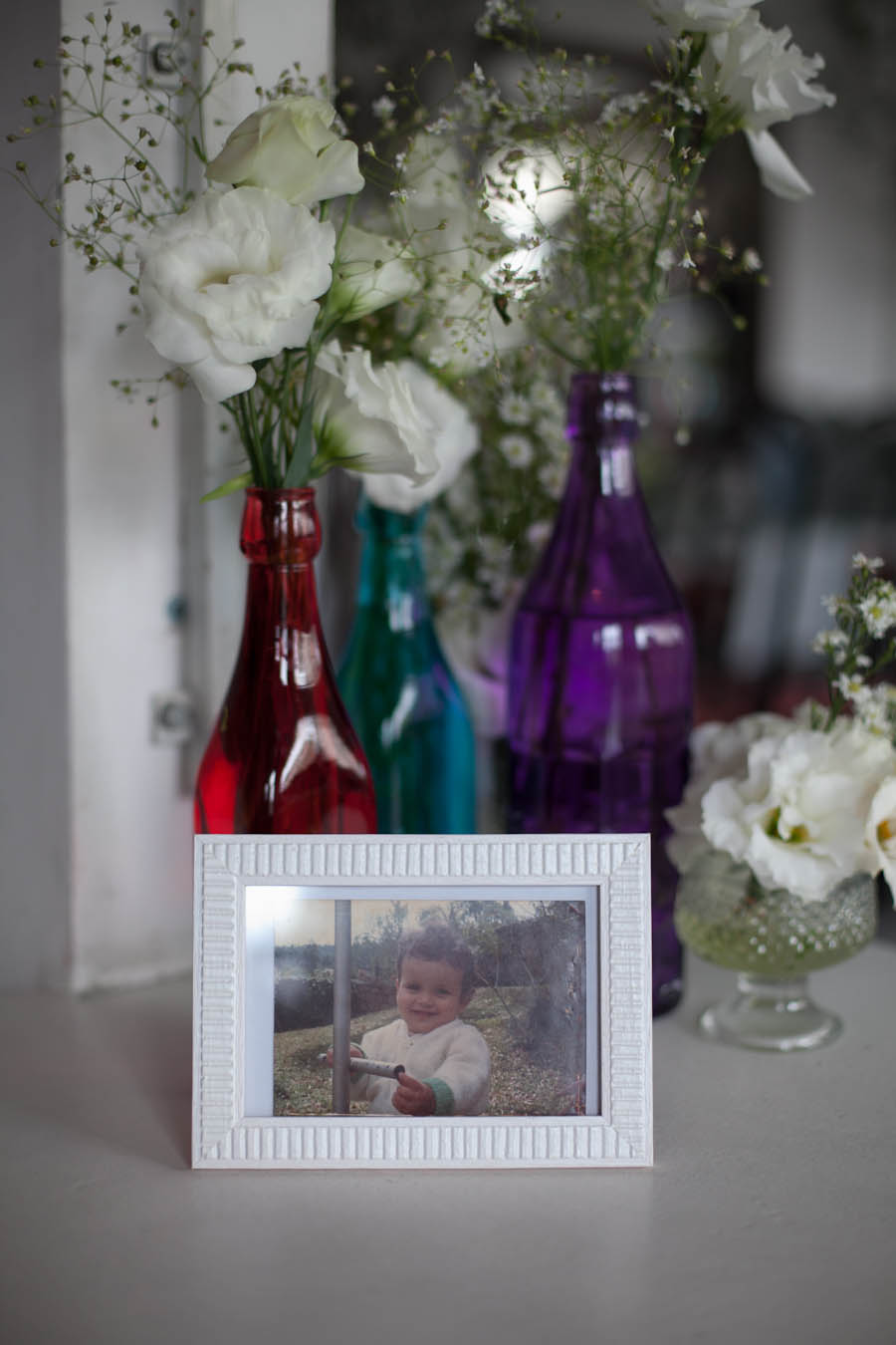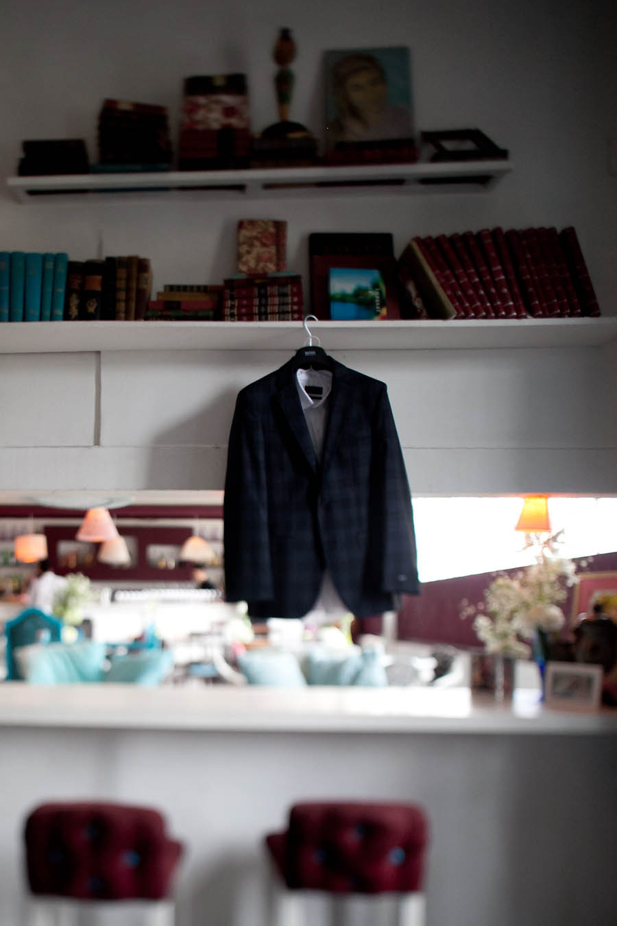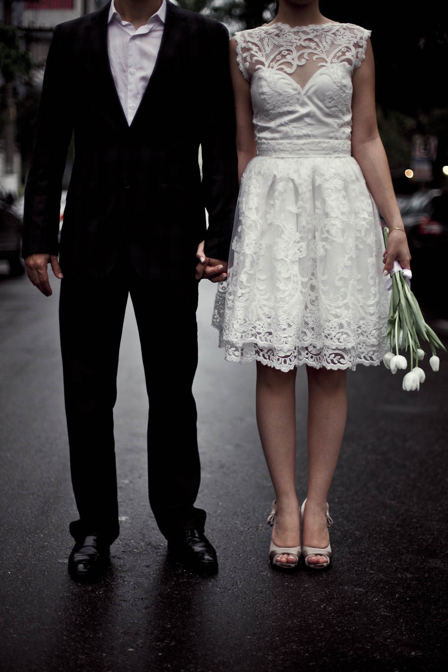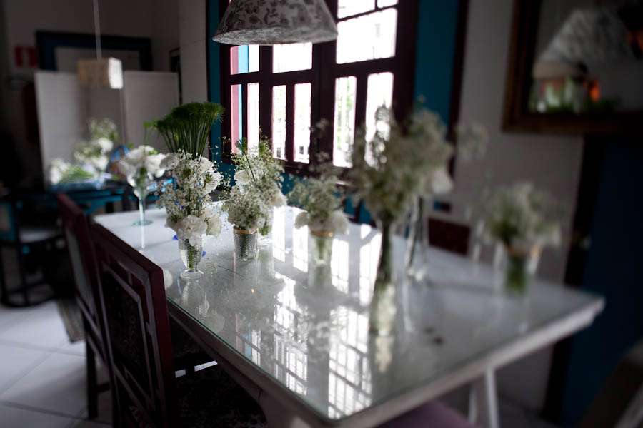 Marcela and her Mum also made as much of the wedding decor themselves as they could including the table runners and the flowers. “In Brazil, people usually give away little cakes called Bem-Casados as wedding favors,” they continued. “They are usually wrapped in some type of paper or cloth. Marcela ended up not having time to make the actual cakes, but she wrapped them in that awesome blue cloth to match the wedding theme. She even made an impromptu bouquet the morning of the wedding. She decided she wasn’t goning have one, but then decided to wrap a couple of tulips up with a bow and leave them sitting by the cake as decoration – we made her hold on to those for the pictures, that ended up being her bouquet.”