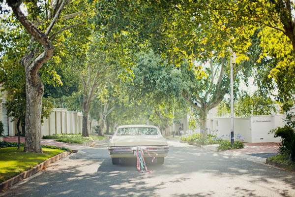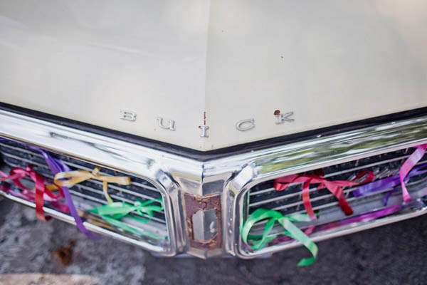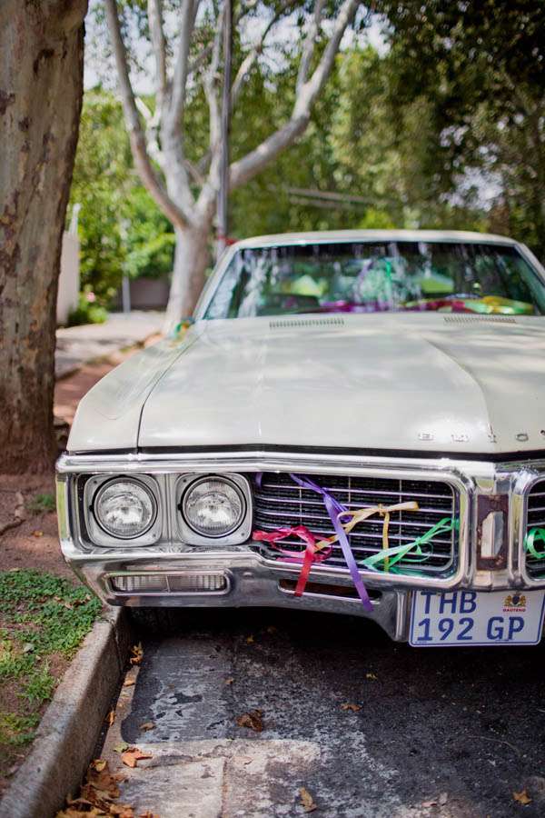 Their wedding car was their own, which they decorated with brightly coloured ribbon and streamers.
